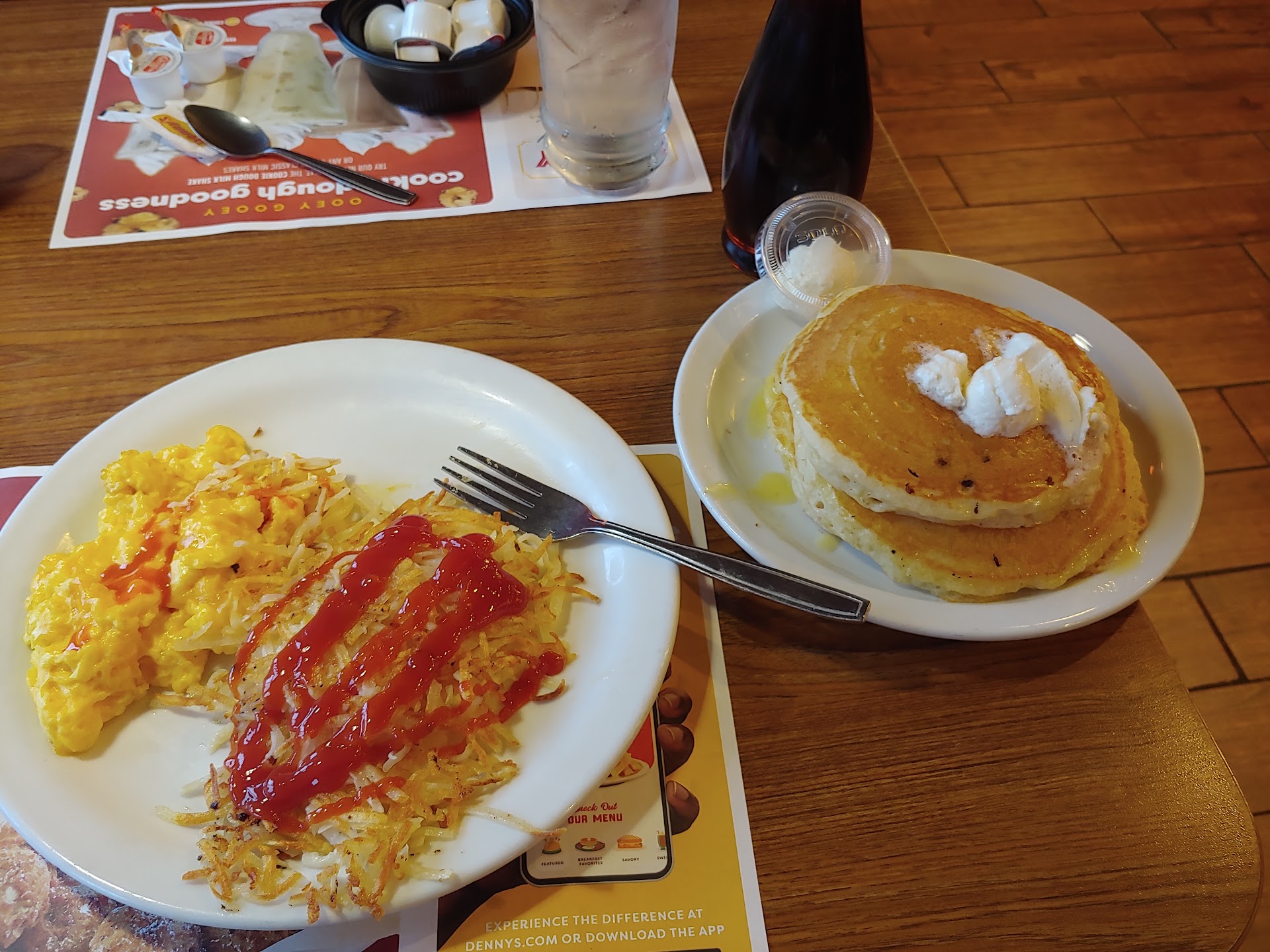 Read moreIt's Christmas day and my son and I decided to try Denny's breakfast at 10:15am after my wife and I had a poor experience sometime ago. (That review below) Anyhow, we walk in and we're told over an hour and a half wait. We waited and listened to the hostess inform every walk in customer the same thing and that they have a bunch of phone orders to handle. All of this is fine but after 30 min, we noticed that all the tables were empty, and that there are 2 cooks, 3 servers and the hostess. We watched the 3 servers just stand and face the cooks waiting to bag up orders which clearly didn't take 3 of them to accomplish. Why are they not mixing in walk in customers with phone orders? Other Dennys locations say that's what they're suppose to do. It is quite obvious this location's strategy is to handle all phone orders first and wait until it winds down before seating folks. Not sure why the owners operate this way in a large brick n mortar building. The point is, if you're trying to sit and eat at this Denny's, stay clear. We went ahead down to the waffle house down the road and waited 10min to be seated.