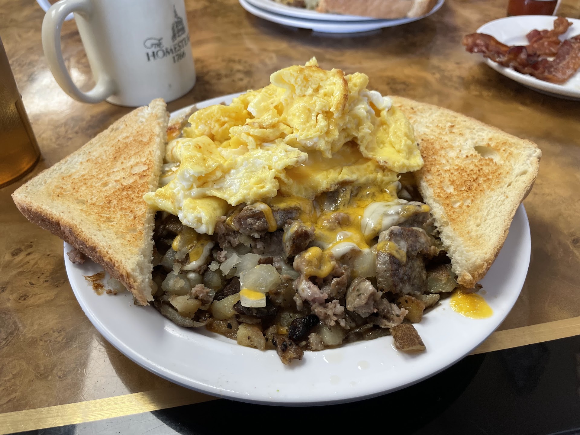As soon as we sat down , the smiling server was at our table. Drinks arrived quickly. After a brief explanation from our, my son and I ordered the Can You Handle “The Truth” breakfast—basically an all together combination of hash browns, bacon, sausage, gravy, cheese and an egg with toast. It is not an elegant looking breakfast, but we both enjoyed our meals. My wife ordered a Waffle. She thought it was a good waffle. I sampled a bite just because she was getting full and I don’t like to waste food.