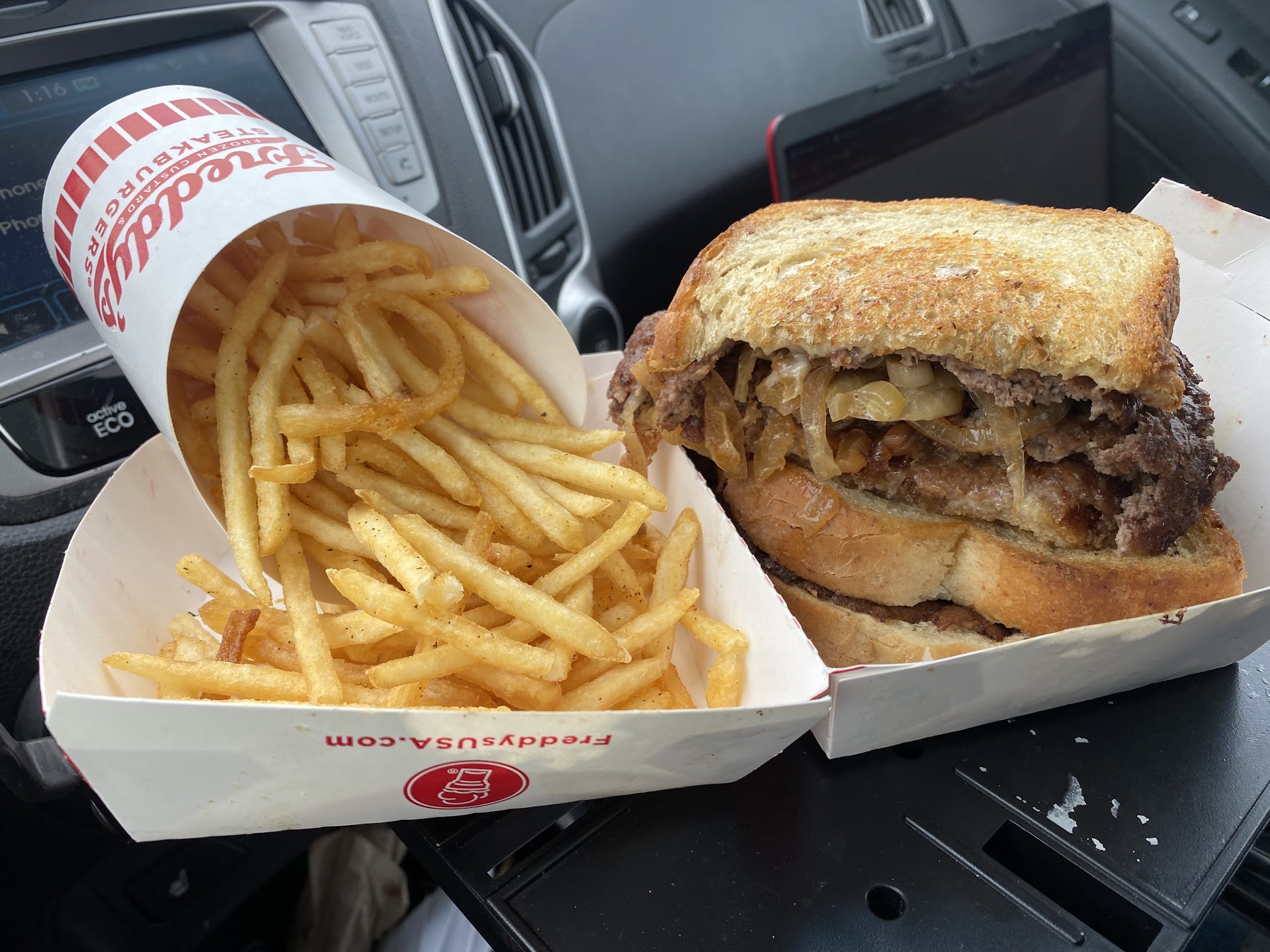 We've had a bit of a rocky experience with this location so far, but we would definitely be willing to go there again in the future. After months of wanting to try Freddy's, we placed an order for carry-out on the website last night at 9:14 (it said it would be ready in 10-15 min), and my husband went to pick it up. They were SWAMPED, so he opted for the drive-thru and got to the window around 9:45, where he was told that they hadn't even started our order yet. We were admittedly tired and irritable with two equally tired and irritable toddlers, so we just didn't have the patience to wait any longer. I called at 9:50pm to cancel the order, but couldn't get ahold of anyone, though that wasn't surprising considering how busy they were. I stopped by this morning to speak with someone and explain what had happened, and they offered to remake our order, which I happily accepted. I guess the order was put through as dine-in, so I asked them if they could pack it up for me. It wasn't until I got home that I realized the employee who packed it forgot to put our fries in the bag too, which was disappointing.