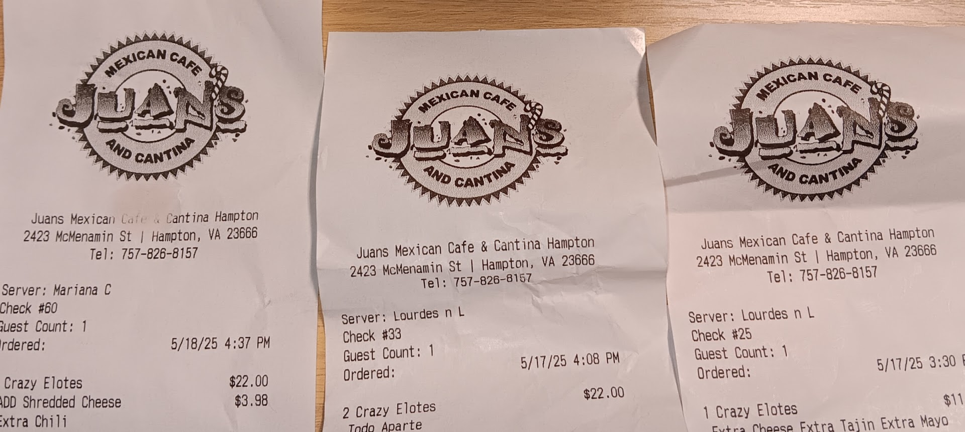 I was doing some shopping downtown and noticed Juan’s Restaurant. I thought, “Why not give it a try?” So I went in, sat down, and had a wonderful server. I ordered a few drinks and two orders of corn—one of my favorite things. Everything went well that first time. I even tipped generously and left satisfied.