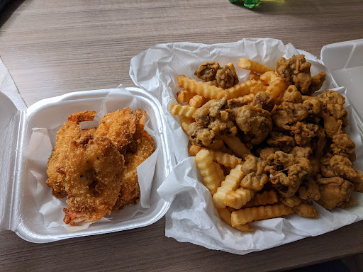 Make no mistake this is primarily a takeout place. It is not fancy. I had the shrimp and the chicken gizzard with french fries. The shrimp were butterflied and the coating was quite good. There are not many places that serve chicken gizzards and the coating on these gizzards was also quite good. There is a small refrigerated counter with trays of food and ice but it's hard to tell what's in the trays. The prices were okay and the five-star rating is for the food only and has nothing to do with how the place looks. While I was there waiting for my food at least five other people came in for either telephone orders or ordered at the counter. There is a small table with chairs but I would not call this a restaurant and would only use the area as a waiting place for your food to...