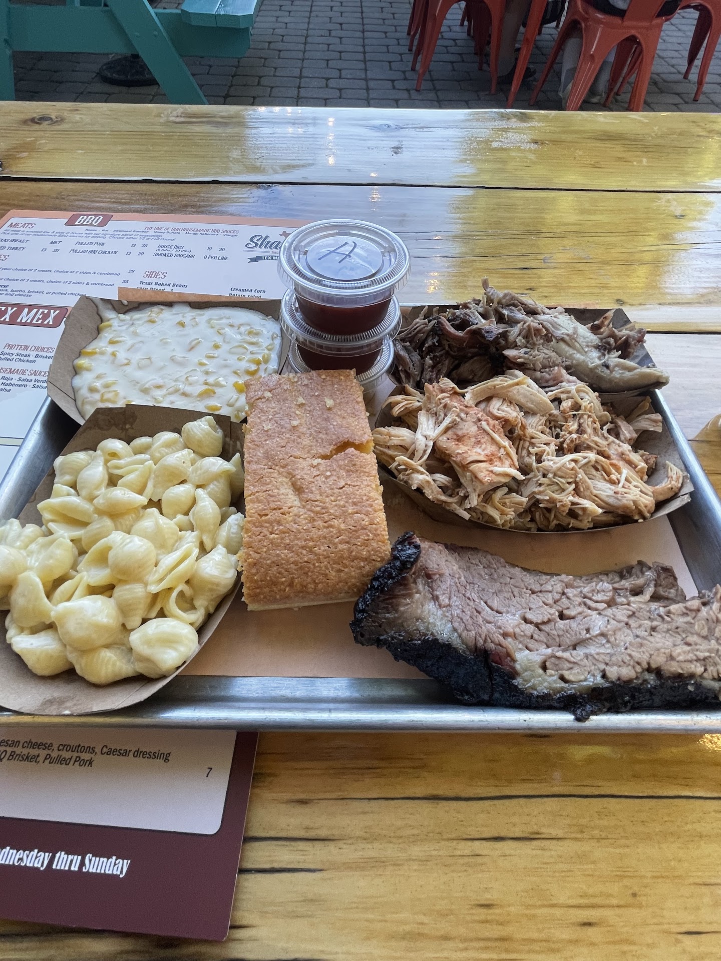 FOOD: I ordered the house brisket with house bbq sauce, slice of white bread, potato salad. The brisket was AWESOME. Itās been about 3 years since Iāve had brisket as good as home outside of Texas. Great job here. The flavor was perfect. It wasnāt dry. You could really taste a lot of flavor in every bite. The BBQ sauce, all four flavors offered, were a big let down for me. I was not a fan of any of them. The one that came across best was the vinegar bbq sauce but even that one needed a thicker consistency. I couldnāt pin point the ingredients of the house sauce but I just know it was not my cup of tea. SPEAKING OF TEA. *Shaneās if youāre reading this - PLEASE just brew your own tea fresh in house. The tea is like drinking lemon water with a teaspoon of tea in it. I super 100% do not recommend it in its current state. the other food items on my plate were well done. I would order them again.