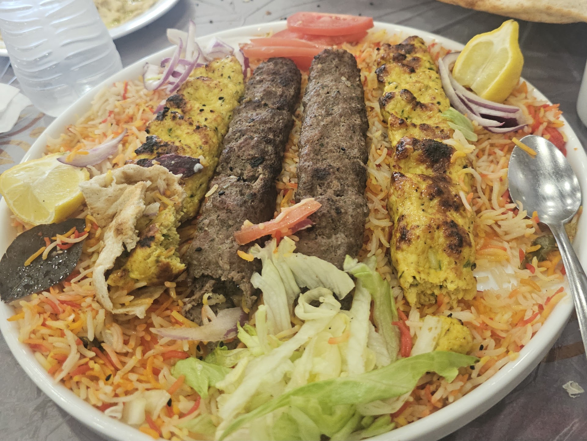 I was craving kabobs/middle eastern food the other night and this place came up closest to me on google maps and decided to give it a try. I went in and I was the only customer in the restaurant which kinda made me nervous but I decided to still go ahead and order. I had ordered a chicken kabob over rice which cost $14 before taxes. While I waiting outside the person who took my order said they had ran out of chicken kabobs which I kind of thought was weird considering how slow it looked inside the restaurant. But I do understand things do happen and he offered other items for a substitution and went for a grilled chicken over rice which was the exact same price. The order took about 10-15 minutes. The platter came with, of course the grilled chicken (bone in), rice, salad, an extra side of salad with chopped cucumbers and a sauce on the side which I didnt really like. The chicken had plenty of flavor and was in between tender and dry. Everything overall was good. The only thing I would say the dish needed is some type of white sauce to pour over it cause after a while the dish was starting to get dry. Overall it wasnt horrible and it was a lot of food. I will definitely go back to try other menu items or even try the kabob like I wanted to order originally. The place is bright and has a unique interior design. The ceiling looks like the marble wall design they have on the walls. Other than that, there are plenty of booths and tables if you choose to...