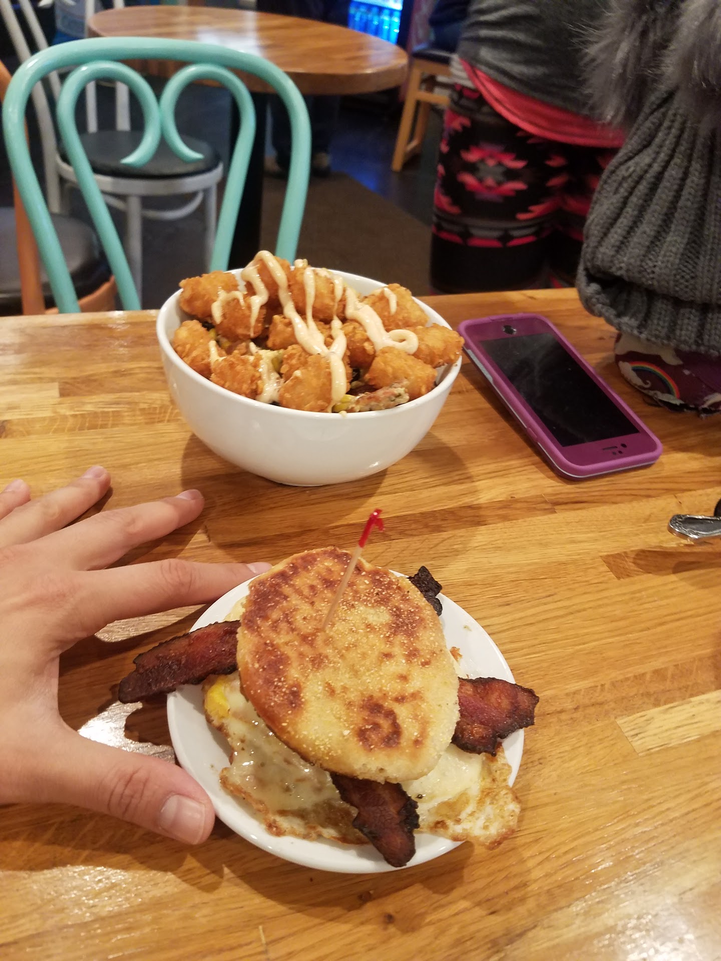 We got the homemade english muffin with egg, bacon and cheddar as well as the mexi bowl and added sausage and tator tots as a substitute for the grains and a dirty chai. Together it cost us about $23.50 (without tip).
