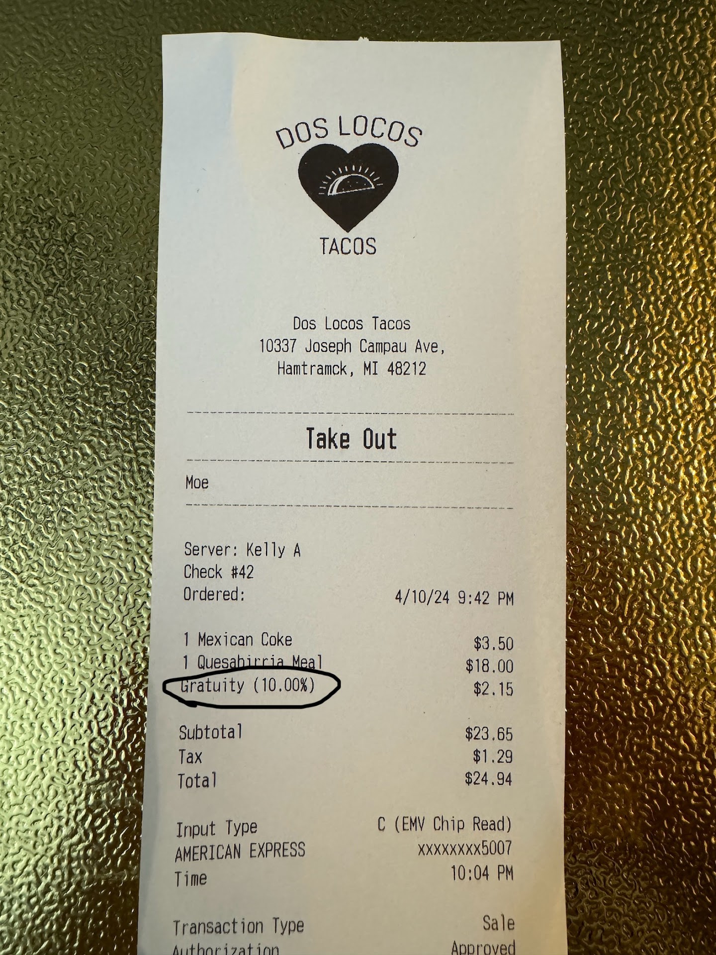 Id like to first start off by asking, does this look like a taco, or a small quesadilla to you? I was charged 2.50 for the measly 2oz sauce on the side as well. To say my experience at this Dos Locos location was a disappointment would be a huge understatement. From the moment we walked in, I could sense our server/host (she was the only one on; brunette, short in height, late twenties to late thirties in age) had had a busy day. So I wanted to be empathetic, but knew our service wasnât going to be good either. what was received had much to be desired. There were only two other seated tables (one who had for sure gotten their food already) and we were told that there would be about a twenty minute wait for food upon ordering (ended up being longer, mind you we came between 8pm-9pm on a Sunday). That was no problem for our group, as we were so hungry and Dos Locos is usually so highly recommended . I was confused though due to the lack of business on the inside of the restaurant , but I can understand how the line can get backed up when A LOT of takeout orders come in at once. #1 never trust a Mexican restaurant that has Valentina as the table sauce, or doesnât serve free chips and salsa out the gate. Leave immediately and never return.