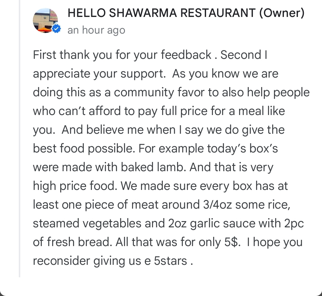 Good afternoon everyone, In the above review I had some concerns with Hello Shawarma. I did not erase it because I want everyone to understand the whole story. The very next day after I wrote the review. I received a call from the manager expressing his concern for my review. He then apologize and delivered a salad with everything to my job the next day. He stated that teachers work hard enough. Ever since that day the salads have been fresh and full. Several other teachers have begun to order as a result. This is the first time I have written a review and received a immediate response. It made me truly feel like a valued customer. So thank you to everyone over at Hello Shawarma. The food has been delicious. I appreciate the...