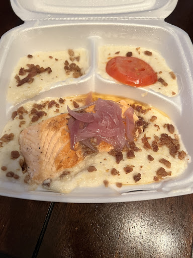 My husband ordered; Salmon and Grits...w/ Grilled Tomatoes, Bacon & Caramelized Onions.