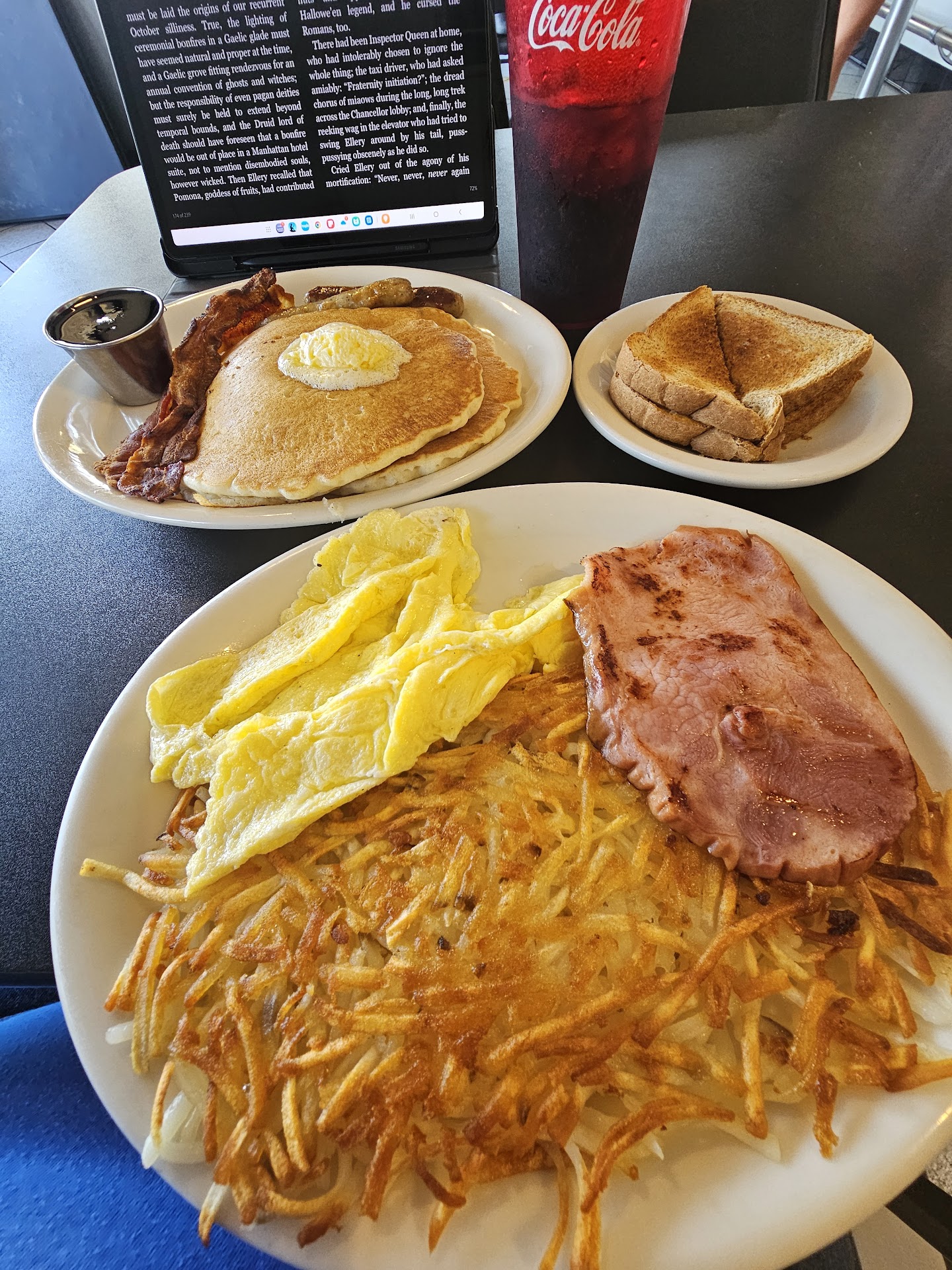 The menu offers a good selection of breakfast and lunch options. Prices are pretty typical. They do have handwritten signs about such specials on school days (there's a high school across the street), which were pretty good. But I opted for their breakfast sampler.
