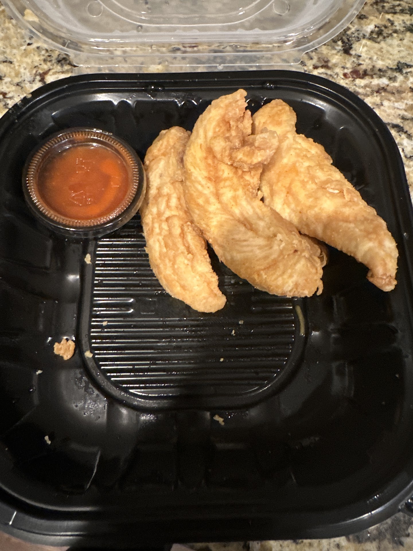 Food Quality : It seems like the portions on french fries keep getting smaller and smaller also; 2 oz of dipping sauce for 5 pieces of Chicken?? I ordered Chicken Tenders and they were bland. This was my 3rd visit where I've given the Tenders a shot hoping they would be ok and they still weren't. I found them partially battered and falling apart which tells me the cooks probably cut 'em open to make sure they're completely cooked before serving which is appreciated, but a food probe will take care of that for you.
