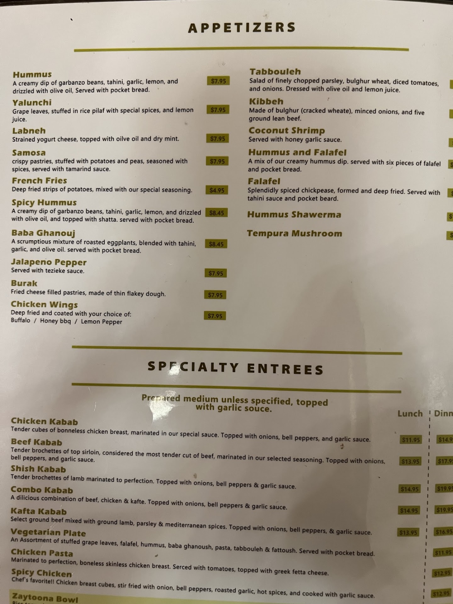 Read moreFirst time here, so I tried a few things. Wanted to see how it compared with Pita Kabob and Simply Mediterranean. Lamb and beef kebabs were great!!!! Cooked perfectly to my request (medium rare) and amazing flavor from their seasoning and grill, for me better than both places listed above. Also the veggies (onions/peppers) served with them I found to be better and more evenly cooked. Beef Shawarma-was good, but preferred Simply Mediterraneans. Hummus-had the spicy. Good, not the best. My preference