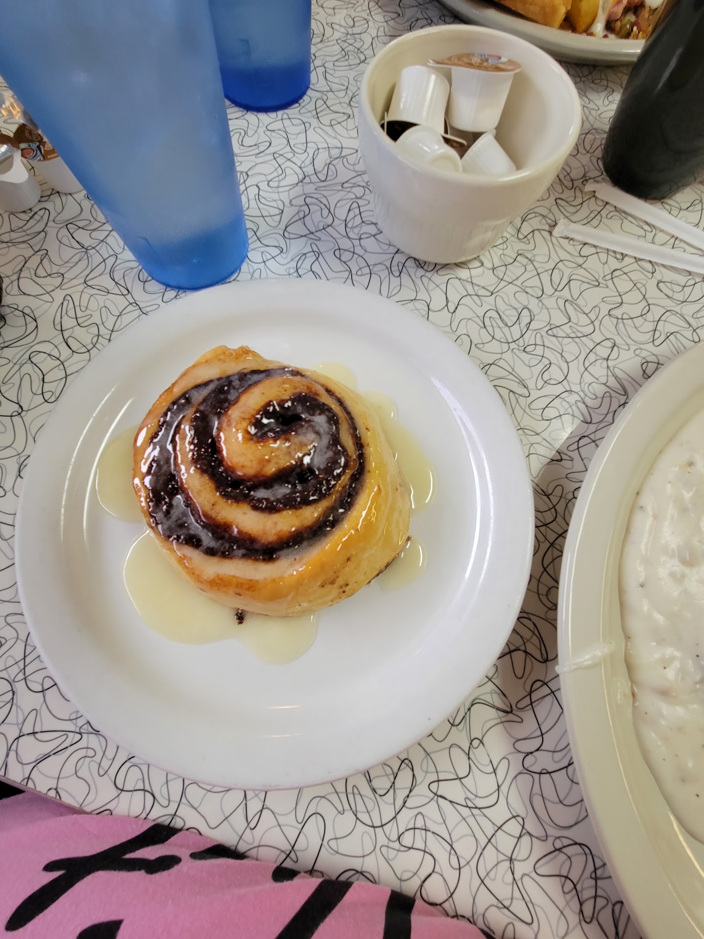 We settled for kids pancake+bacon+sunny side up egg+strawberry milk. I had an over easy egg, has rone, and 1/2 order of biscuits +gravy.