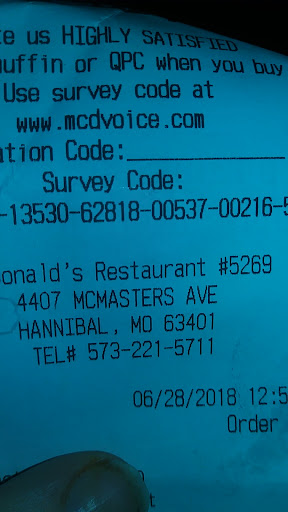 This McDonald's may be the only one in Hannibal but don't waste your time and I insinuate TIME going here... Always check your orders before leaving because 90% of time they are wrong or missing something. Customer service from managers is terrible and they act like it is customers faults and offer no apologies. Last but not least CHECK YOUR CHANGE... these employees want $15 an hour but can't make basic change that is printed on a receipt. I recently was ripped off $11 by their drive thru--- when I went inside to show manager she acted like I was lying, told me she would have to count drawer which I told her to go do, and then when she came back after 10-15 min of me standing in lobby she offered no apology but just handed me my change saying oh I found the error... well no kidding and now I also have cold food but was offered no apology or new food.. AVOID THIS MCDs at all costs!! I will be contacting...