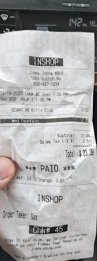 Read moreI ORDERED MY MEAL @ 12:08 9-2-25 I DID NOT RECEIVE MY FOOD UNTIL 1:19 "THATS NOT FREAKY FAST"! THE LAST TIME I WANTED CLUB LULU ON SQUARE WHEAT AND THEY SENT THE ROLL. THEN THE DELIVERY DRIVER STATES I HAVE BEEN BANNED BECAUSE I GOT UPSET WITH THE GIRL ON THE OTHE R LINE. OFCOUSRE IM UPSET I HUNGRY AND ONLY HAVE AN HOUR FOR LUNCH. SHE GAVE ME EXCUSES THAT THERE IS CONTRUCTION TRAFFICE I AM AROUND THE CORNER FROM YOU . NO TRAFFIC. I WILL BE CANCELING MY CREDIT CARD TO TEACH YOU A LESSON ON HOW TO TREAT CUSTOMERS AND NOT LIE TO THEMHOW DARE YOU TELL ME YOU WONT DELIVER TO ME AGAIN I HAVE BEEN A CUSTOMERS FOR 20 YEARS TO JIMMY JOHNS. POP WAS WARM AND FLAT ALSO SANDWICK WAS WARM NOT COLD. YOU CHARGE $18.53 FOR CHIPS,SANDWICH,AND COKE. ALSO INCLUDES YOUR DELIVERY CHARGE. I ASKED ONLY FOR THE DELIVERY CHAGE BACK WHICH i THINK WAS ACCEPTABLE. REMEMBER YOU STARTED THIS. ALSO I AM THE CUSTOMER TREAT US AS SUCH AND MAYBE WE WILL BE...