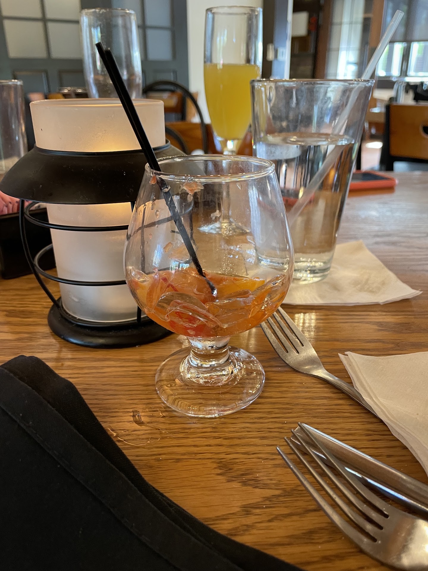 I ordered a cappuccino as my coffee course, and it turned out to be not a shot of espresso and a lot of milk foam, but a latte with what I think was cinnamon powder sprinkled on top, and the espresso was rather more bitter than I expected. A cappuccino is a shot of espresso, a small amount of milk, and very thoroughly aerated milk foam, such that the aeration makes it sweet enough to balance the intense flavors of the espresso. While I realize that it's a steakhouse and not a coffee shop, if I'm offered a cappuccino, I expect a cappuccino. I wasn't expecting it to be a good cappuccino, but it wasn't a cappuccino at all.