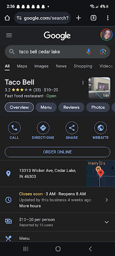 Read moreMy review of 5 is comparing to other Taco Bells that I have been to since it is a well known chain. We ordered a 3 Crunchy Taco Supreme Combo and substituted the typical soft drink of Pepsi for a specialty Wild Strawberry Creme Delight Freeze (reg size) just to try something different for the review. I was charged .80 for the upgrade and the drink was very good and thick. The filling in the taco supremes was enough and as expected. We also ordered the Chicken Quesadilla Combo with the standard Pepsi and that was very good as well. When we arrived at the speaker though there was a sign that their fryer was down for some reason so the fried desserts weren't avail. at the moment and the special fries they have weren't avail. Their loss as I probably would have ordered the dessert. But since the place is brand new it is expected that they will want to make sure everything is running or operating in good order. Service was friendly, Will post photos, having a few issues posting them today but will add them. So glad to see another business in Cedar...