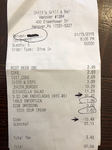 Visited this Chili’s for the first time with my wife and daughter around 8:30pm. Place was not overly busy in the dining area; bar seemed to be getting more attendance. -Initial impression: Old and in need of updates or just a good cleaning. -Initial interaction with waitress: Standard restaurant greeting. -Order: Bacon Cheesburger, Quesailla Salad, Chicken Enchiladas, and a to-go Chicken Enchilada to take home for my son. -From there it goes south. Our waitress was not pleasant at all. Her interaction at our table was short and generally was only when she was dumping off refills on sodas [that we didn’t ask for] without a word. There were some high-schoolers in the booth in front of us that the young wait staff seemed more concerned with hanging out with than doing their jobs. Our wait on our food for the amount of people in the restaurant was longer than expected but we’re pretty patient. -When the food was delivered, it was by a different girl. As she was placing our food on the table, she dropped my entire dish of Chicken Enchiladas on the floor. She was very sorry and I was very okay about it; she’s young and things happen- again patience. Another young man comes by to clean up the mess and assures us that they’re rallying the troops to prepare my dish again. Hardly a word from our own waitress. We ask for some sour cream for my wife’s Quesadilla Salad that didn’t come with it [this is relevant later]; a small dollop is brought in a disposable cup. -It takes a while but the re-prepared dish finally comes. When it’s dropped off the girl who dropped it makes a joke that “she saved me from the original dish by dropping it”... actually funny and I don’t take offense to it. I wish it were true though... I realize this isn’t an “authentic mexican restaurant” but this is probably the worst chicken enchiladas I’ve ever had. I don’t know how you make soft tortillas covered in sauce hard, but they accomplished it. Bland, flavorless dish that was more black beans than anything else... terrible. Btw... no one stopped to ask how the dish was or how we were doing during this time and I have no idea if a manager was even present there. -We complete our meal and ask for the check and double check that they added the take home Chicken Enchiladas for my son. Waitress assures us that she did, goes and gets the bill and drops it off. We see on the bill that they’ve charged us for 3 Enchilada meals rather that 2 [but caught it and “comped” 1, so, we’re still paying for the 2 we ordered]. We also see that we’re charged .80 cents for the dollop of sour cream that my wife requested for her salad and 1.99 for table entertainment that no one used. Seriously, you’re charging us for sour cream??? And a game that we didn’t play??? And you’ve done NOTHING to make up for the poor service??? As you can imagine, I’ve been progressively getting more upset by the time we’ve reached this point. I just want to get my son’s take out and get out of here. Can’t even do that though because the waitress is still more concerned with hanging out at the table in front of us [see the pic with the two waitresses standing in the grey tshirts-faces blocked out; at times there were up to 4 waiters/waitresses at that booth]. I actually had to say “excuse me, but could you take care of our check?” I got a look and a “just a minute” while she finished her conversation. Then our waitress swooped the check off the table without a word to go process it. -At this point we’re still looking around for someone who looks like a manager [or even an adult] to no avail. We complete the payment at our table and wait another 5-10 minutes for my son’s take out. I’m just hoping at this point that his Chicken Enchiladas are better than mine... FYI... they weren’t. -Funny thing is my wife was wanting Mexican or Tex-Mex for dinner and we skipped a “hole in the wall” restaurant to go to Chili’s instead because my daughter wanted a burger. Probably should have gone to the former. Worst restaurant experience we’ve had in...