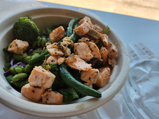 The parking was a little tight and it's a shared location with Smoothie King next door. It's glassed out so I could see upon arriving a group of employees from both locations in corner sharing a table. Kennedy greeted me. She was very pleasant, answered all questions and took my order. Jerk Bowl and Salmon Bowl with brown rice. She offered a sample of tea and lemonade which was pretty good and I decided to get one for my husband. The food took about 15ish minutes to make 1-2 people placed orders after me and everyone was pretty spaced out except for the group employees.