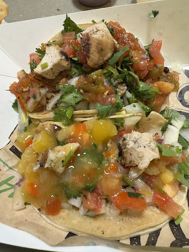 I always get 2 tacos, with incredibly fresh salsas. Since they have 6 available, I get mild mango on one of chicken tacos. The other taco I always get hot Baja, which is super savory! On my free tortilla chips, I put fresh tomato from the pico de gallo and lime with cilantro on top. So basically 5 out of the 6 offerings from the salsa bar, I enjoy every visit.