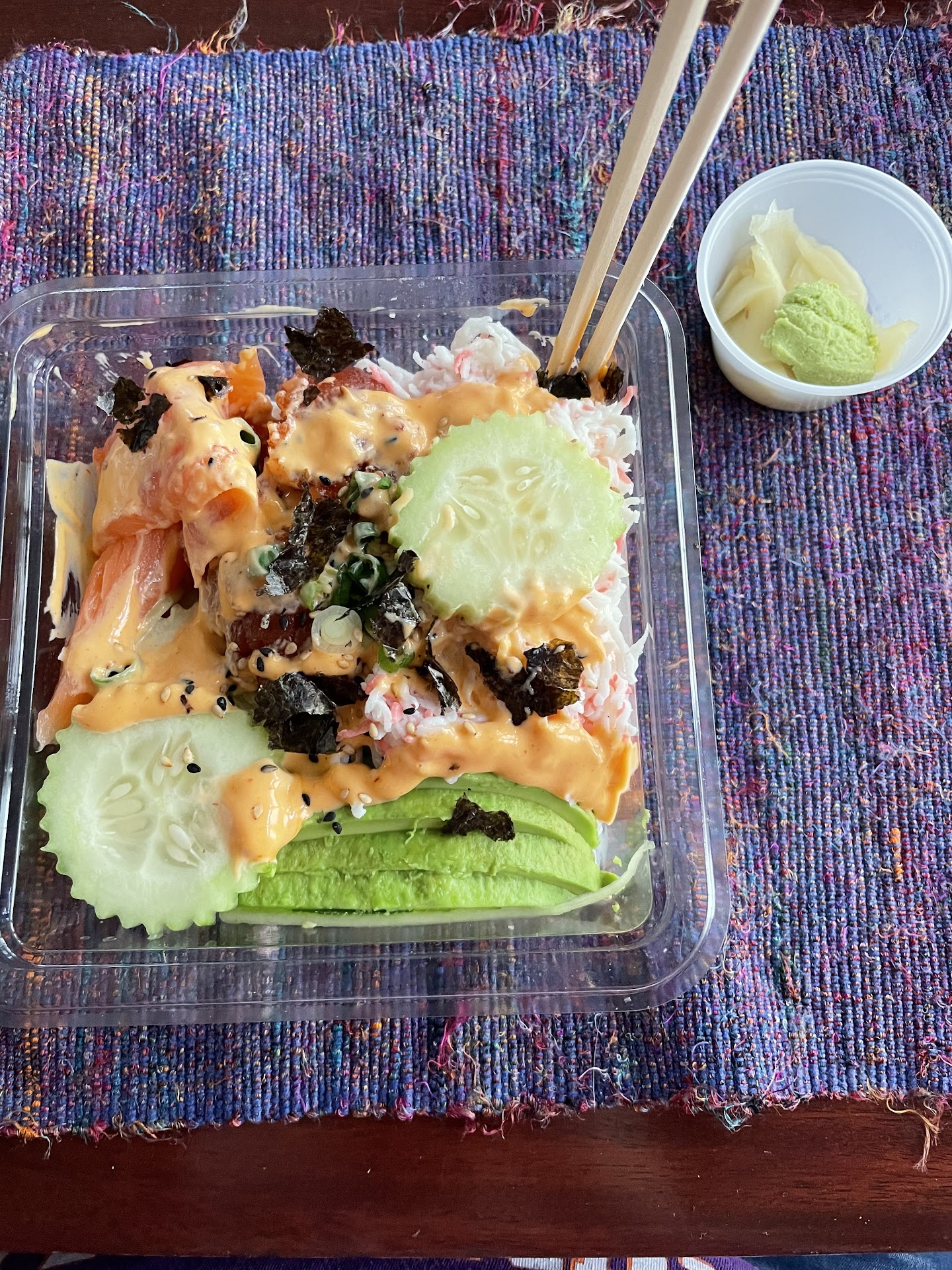 Salmon poke bowl: great flavor, rice is well blended with just the right amount of vinegar. Salmon is fresh and bursting with great taste. Accompanying avocado is fresh with slices of cucumbers.