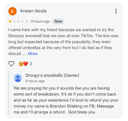 I came here with my friend because we wanted to try the Droopys snowball that we saw all over TikTok. The line was long but expected because of the popularity, they even offered umbrellas at the very front but I do feel as if they should have more covering because a lady passed out from the heat while we were there. We kept wondering what flavor the âDroopysâ was because it couldâve been anything and we didnât want something that we thought was gross. There is no sign indicating what the flavor may even be so when we got to the window I asked what the flavor was and was met with a very rude âitâs a secret family recipeâ Iâm not trying to steal the recipe I just wanted to know a flavor profile before I wasted my money so my friend asked for a simple flavor profile and she said âI donât knowâ so I asked if itâs bubblegum because that was the main flavor I wanted to avoid and she then was able to tell me no and that itâs like a sweet cream. She couldâve told me the actual flavor profile which is quite literally a creamy cotton candy. Nothing special but they make it seem like itâs a secret from the heavens above and that itâs literally âto die forâ. I then started to look at her TikTokâs and realized how rude the owner is and itâs the same lady that took our order. I do not and will not support a business who thinks their shit doesnât stink over a mediocre COTTON CANDY snowball. My friend also tried commenting on their TikTok to answer some people on what the droopys flavor was and she was IMMEDIATELY blocked by the page. So makes sense as to why you only see positive comments on TikTok. I wouldnât support these people, there is absolutely nothing special about this snowball stand. Just get you a cream cotton candy at your local place, I guarantee you it will taste the same without the rude owners...