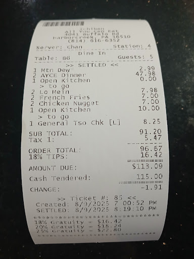 Read moreFood was cold and service was terrible. We ordered the all you can eat buffet and after an hour had only received some of the things we ordered (we only ordered 4-5 things including soup and salad because they charge for waste) we had planned to order more after we finished the first round but we're never given the chance. We never received drink refills, we were never asked how the food was (so not given the chance to send back the cold dishes) we attempted to wave the waitress down, attempted waving down other staff (and was blatantly ignored), and went up to the bar but no one was there at that time.. After waiting an hour and being ignored we finally gave up and went back to the bar where we were finally approached by our waiter but just to give us our check. The bill was over 50 dollars! I went to the women that was now at the bar and explained that we never received all of our food, the food we did receive was cold, and we were never checked back up on to order the additional food we wanted to make it worth almost 25 dollars a person. The I'm assuming manager was very rude and just wanted argue. Eventually after back and forth arguing she took a small discount off.