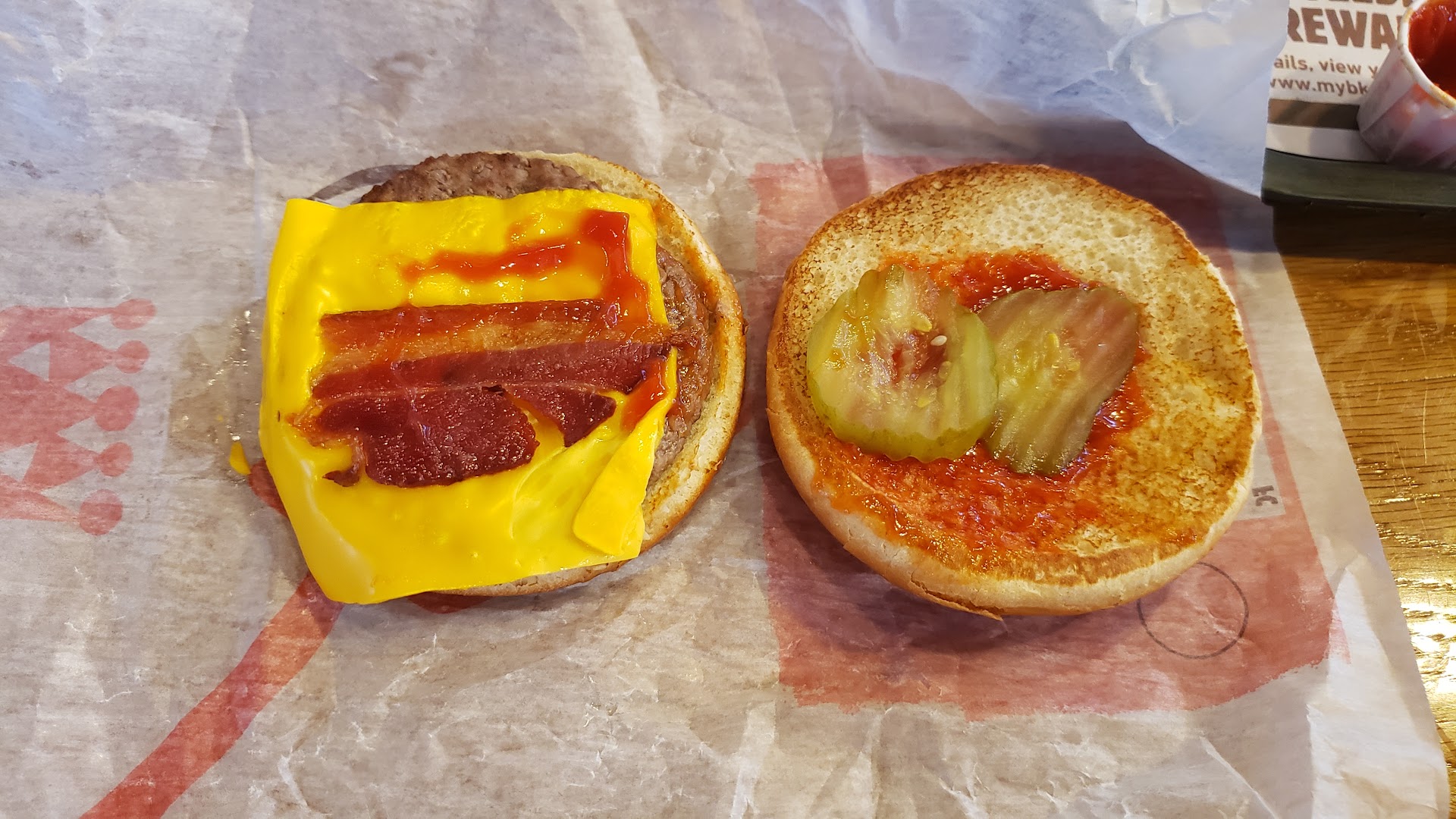Read moreThis location appears to be falling in to the all too common disappointment of opening strong and then quickly fading in terms of value and quality. We were initially excited to have a Burger King close to us and ate here several times a week. As each week passed since their opening back last fall/winter of 2018, so did their quality control and attention to detail. This is sad as they could be a great option in this area. However, to make it here, they need to focus on training and consistency of standards. Attached is a pic I took of my Bacon Cheeseburger this evening. This is before I have done anything to it. I simply removed the top bun and took a picture. As you can see, it left much to be desired. Additionally, french fries were cold and onion rings were cold and soggy. Vegetables were wilted. Overall, every item in our orders were of poor quality and absent of any pride or concern.