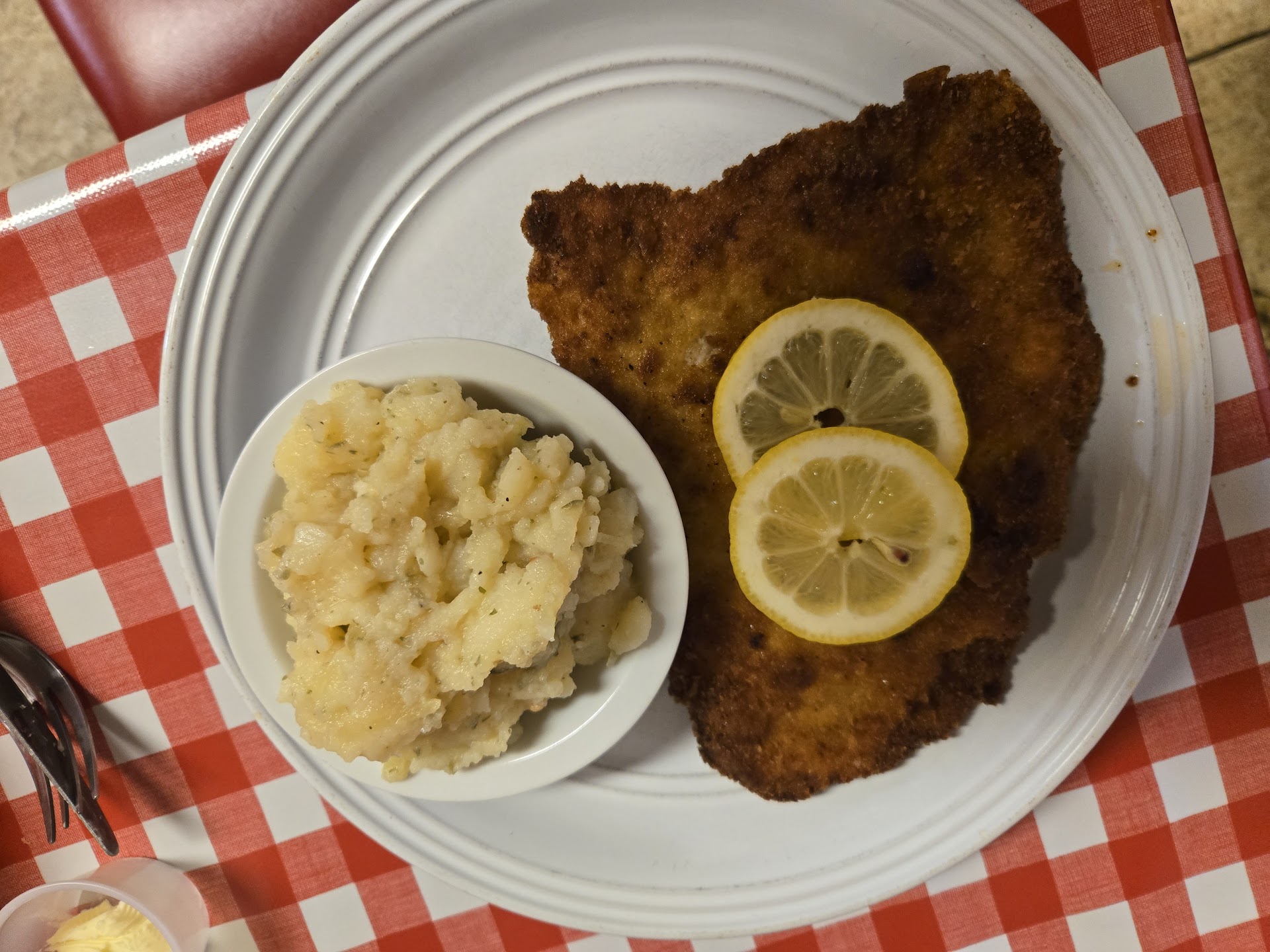 The schnitzel (pork) meat and crust were to perfection, but a but more spice could be helpful, although juicy, cooked to perfection they were bland.
