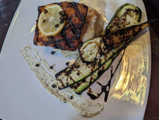 For the main course, I had the 16oz T-bone, my wife had the grilled salmon. The steak was well seasoned and cooked as ordered, but again was low quality. Very gristly around the edges of the entire steak. It came with garlic mashed potatoes which were dry and had an extreme amount of garlic in them. I like a good amount of garlic, but this was over the top. The seasonal vegetables were yellow squash and zucchini sliced with bleu cheese crumbles and a balsamic drizzle. These were fairly good.