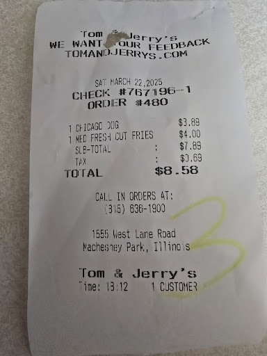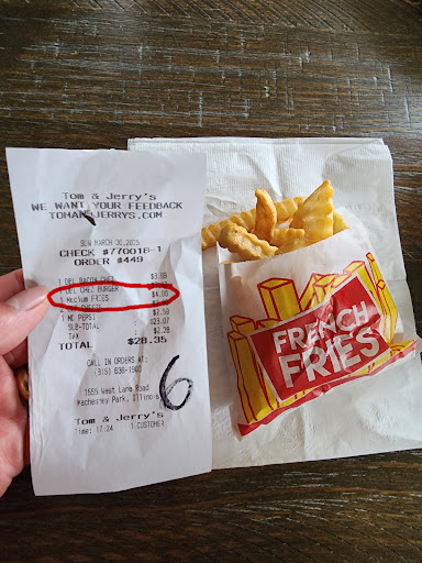 Read moreI normally love the food at Tom and Jerry's, however last week I ordered a gyro combo, dined in and paid over $10.00 for this meal that looked like the pita was not filled generously with the gyro meat. Also the meat was over cooked and crispy. The fries looked like they were freezer burned and then fried as well. You could tell they were old but warm. There was nobody in the restaurant that has ordered but one other customer. They were not busy. I waited over 10 min to receive my food. By the time i got it, I only had enough time to eat it and get back to work. I know that I should've brought it to their attention when I was there but due to the long wait time and my lunch hour ending soon. I called from work, spoke to a manager, explained that my food was not looking like my co workers food, who had ordered the same meal that same day and had it delivered too. The manager made a compromise with me to only charge me 1/2 of what I paid the next time I came back and ordered it again due to me consuming it already and him not being able to see it. I completely understood and felt that was fair. I also took his advice on ordering ahead of time to save time. So today, I decide to order ahead of time, pick up my food through the drive through and drove off with the impression that my order was perfect. I get back to work, park and when i opened my gyro it had onions all over it, when i specifically ordered meat and sauce only!!!!!! I am disappointed immediately, picked the onions off and ate it anyway. The rest of the food was fine, fresh and hot. How do you mess up a gyro with meat and sauce anyway and add onions? I looked at my order slip and it didn't say add onions. It read just meat and sauce only. I don't want any compensation or a free meal but you guys need to get your stuff together because you just lost another customer!!!!!! I am very disappointed and my expectations of your restaurant are very low. So if you want a always fresh, hot generous meal with no mistakes, please take the ride to Uncle Nick's on East State Street. It will be worth it, i promise you! 2 Strikes and you are out, Tom and...