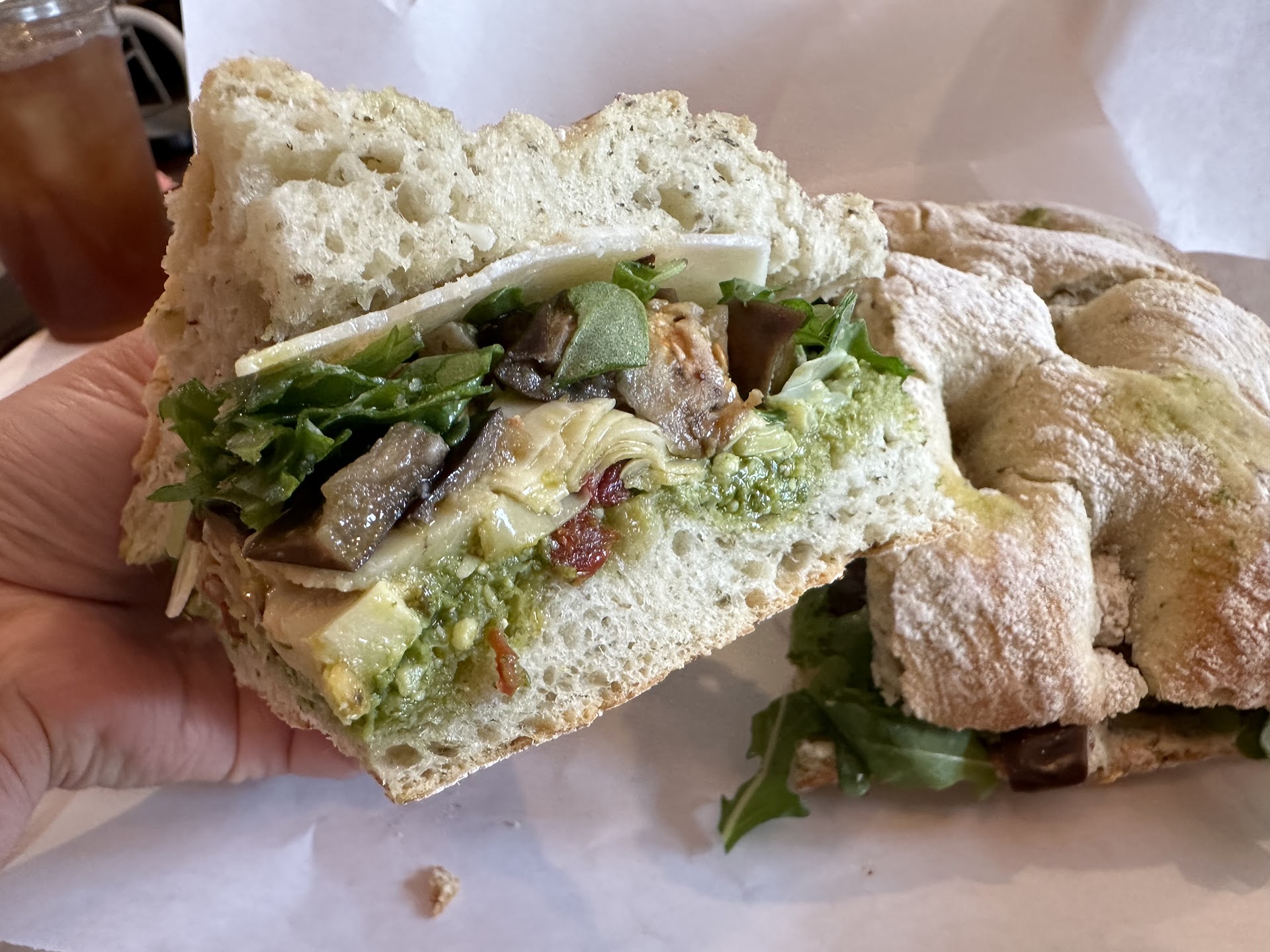 We ordered three sandwiches, but be warned — one can be enough for two. I had the Otaggio on focaccia bread. It came with spicy, roasted eggplant, arugula, artichokes, Parmesan slices, sun-dried tomatoes and a bright, crunchy pesto. I really enjoyed the contrasting textures of the eggplant against the coarse pesto and the flavor combination of the tart artichoke and nuttiness of the cheese.