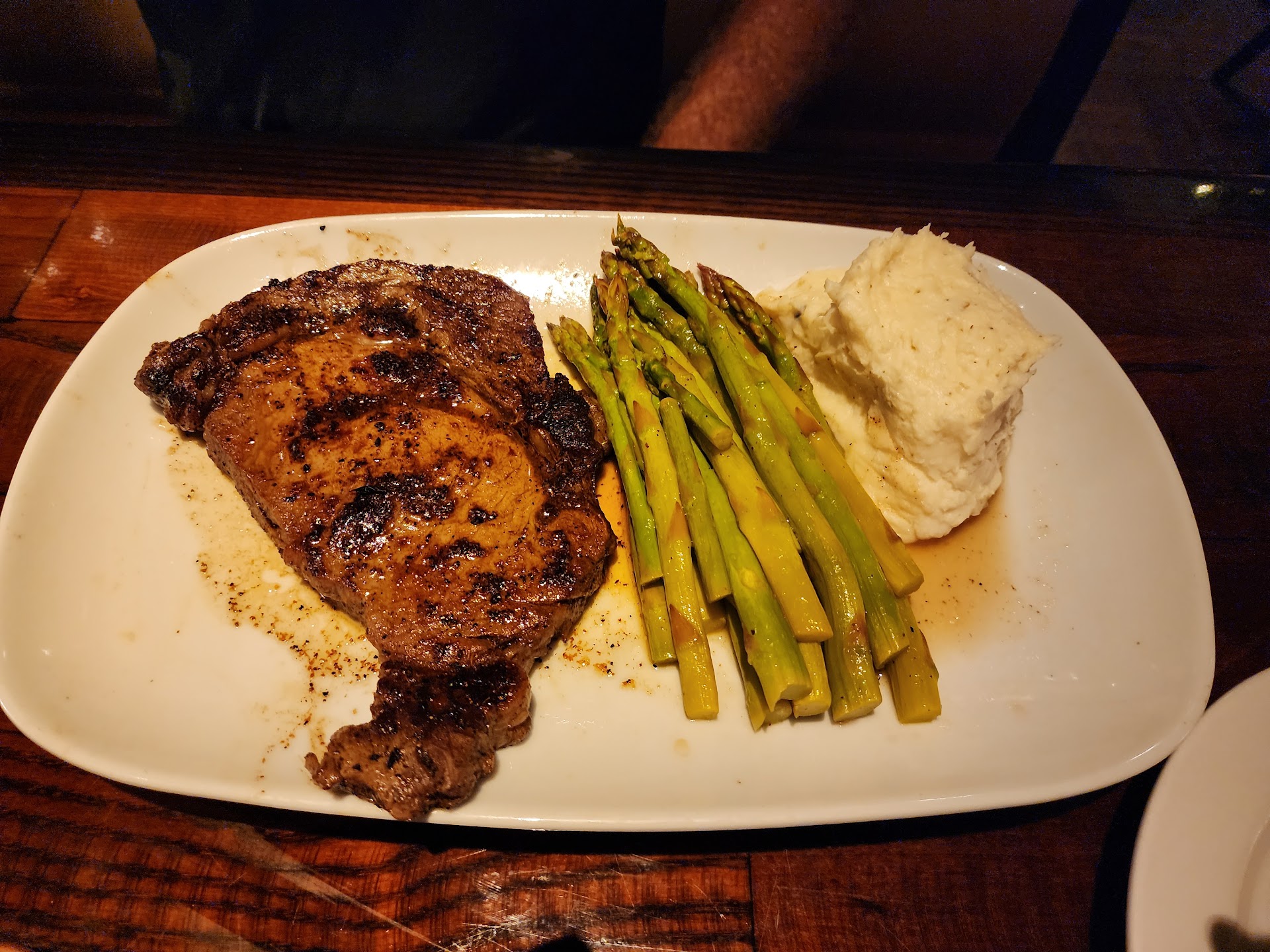 We went for my husband's birthday was good choice. From the entrance as you sign in I didn't like the host sat me right in front of the entrance right then and there I got up and said I don't like this area it's just hot, muggy to close to doors. If I wanted that heat, I'd sit outside. So I told him Move me. So we sat inside more in yet nicer and cooler. Now, my waiter could have been a bit more attentive but was not. The place was a tad empty, but it was not overwhelmed it was a Tuesday, not the weekend. Anyway he didn't check on us much rather want to give a shout out to another (hosts/server) idk his position but his name was Damian he was more attentive and he helped us and others. He knew we were low on bread, said, be done in 2 minutes, and he brought fresh to us. He was not our waiter, but if I had a choice, I'd pick him for my waiter. Now the food was delish, so props to the cook who made our steak was so good. and chicken fried steak was good but a bit to battery. Overall, it was not an issue with the food it was good. Of course, prices are a bit steep but not any worse than any competitors that are over rated everyday. If u know another steak house I'm referring to. But this one is different and the steak is very flavorful, great taste. The corn is very good different but good taste. I loved their mashpotatoes were good, too. Was surprised to see whole fried okra instead of slices as usual in most places. But it is good, just service with my own waiter was not great needs work and be more attentive with clients. I dunno his name never left it. 🤷♀️ so...