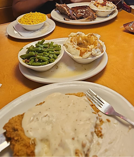 My eldest son enjoyed the 1/2 rack of ribs with loaded mashed potatoes, buttered corn and a dr pepper; my youngest son chose to eat an all American cheese burger w a side of steak fries and a cold coca-cola. I tried the chicken fried sirloin steak smothered w white gravy, mashed potatoes w brown gravy, green beans and an unsweet tea.