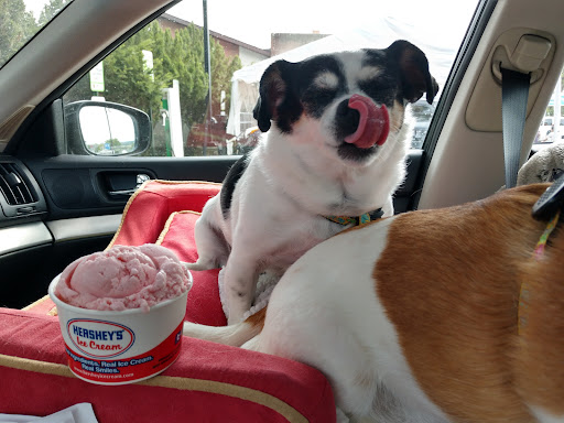 Hershey's ice cream!! Yummmm... But I don't think the cows are free range and on a healthier diet? I got the Strawberry for dog, Lola, and Coconut Chocolate Almond for me! 😋 The strawberries were big chunks and the Coconut Chocolate Almond is soooo good!! Definitely my favorite!! My other dog, Tilly, just wanted to lick the cup and not interested in the ice cream. The staff was nice and responsive, but not overly friendly or welcoming. This seems to be the standard for...