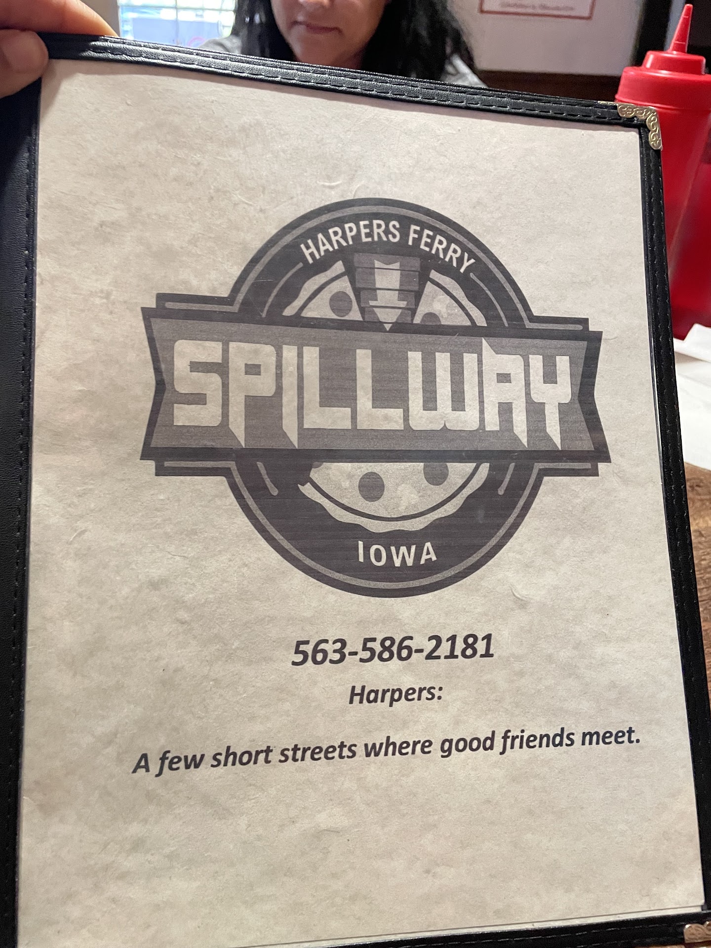 The Spillway is awesome. Halfway between nowhere and the back of beyond along the Mississippi River in far Northeast Iowa lies the very small historic town of Harpers Ferry, where fishing and hunting isnât a sport, itâs been a way of life since the beginning of time. And today, we discovered a timeless rural supper club. Read that; âBar and Amazing Grill & Pizza Jointâ.