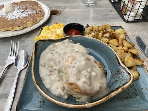 The bad: no one at the front to greet us, rather someone at the cash register with her back faced to us and we had to wait a few minutes to be greeted. We were told after ordering that the kitchen was backed up 30 minutes. I do appreciate our server telling us this but ideally we would be told up front before we even sit down. Our table was dirty and sticky so we had to ask for them to clean it. The food came out 40 minutes later and you could tell most of it was frozen beforehand like the biscuits. Eggs were over-cooked. The breakfast sandwich was advertised with over-easy eggs and bacon and did not come with either; the eggs were hard-boiled and the bacon missing. Pancakes we ordered did not come with syrup. After waiting several minutes for our server to bring us some she did not (she later told us they would give us some syrup to go and they would not charge us for it - we hoped they wouldn’t charge us and didn’t understand that, but it came in a nice glass bottle which made more sense for that comment).