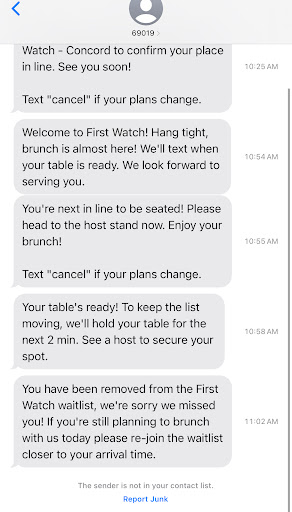 Read moreWe have been to this location before and the service and food were way better at that time (about a year ago). We decided to go again with our children yesterday and joined the waitlist online (gave us a 30-45 minute wait) which is no problem because we were heading that way anyway. We had about 15 minutes left on our wait time when we checked into the front. The lady who was checking us in was nice but when I asked her estimated how much time was left for our wait she told me 30-45 minutes which I kindly explained to her we had already joined the waitlist and waited about 30 minutes. She then proceeded to get defensive and told me that the wait doesn’t start until you check in and that she can get the manager if needed to explain. Why the sudden aggression by asking a simple question? This had all confused me because what is the point of the waitlist if you still wait the normal time at the location. I told the lady that it wasn’t necessary to get the manager and we would wait. We took about 3 minutes to go and park our car because the parking lot was very full. I looked at my phone and get a text saying our table was ready. What happened to the additional “30-45 minutes” we had to wait? No problem - we got inside and told them we got the text that our table was ready. A gentleman im assuming is the manager at this point told us to go sit down while they get our table ready. Then I got another text that we were removed from the waitlist. We went back to the gentleman we spoke to earlier and he told us they texted us so many times and got no response that we were removed. That was a lie because we were not texted multiple times to come for our table and we were already inside waiting when we got “removed”. This caused us to wait an additional 20 MINUTES to get another table while waiting inside with 2 children. We ordered our food and honestly it wasn’t that great. We liked the variety option for meat as we do not eat pork and when we wanted to order the Chicken Apple sausage they were already out of it…at 11:00 AM. So we got the turkey sausage which was links and not a patty and honestly they were disgusting. Very rubbery and looked barely cooked. I got the biscuit with sausage gravy which comes with eggs and potatoes and the only thing good was the biscuit and gravy. The “2 eggs” looked like 1 sad egg and the potatoes were still crunchy. My husband got a Belgium waffle with potatoes and grits and I have to say those were the worst tasting grits I’ve ever had. We had to add salt to a lot of the food and I barely add salt to my food. My son loved his grilled cheese. The Pineapple Express drink was delicious. Those are the only 2 nice things I can say about the food. Our waitress was sweet but very absent and barely checked on us. I don’t think we will visit First Watch again for a long time because this was such a disappointing family experience. The food is somewhat reasonably priced for today’s economy but still pricey for some families so beware...