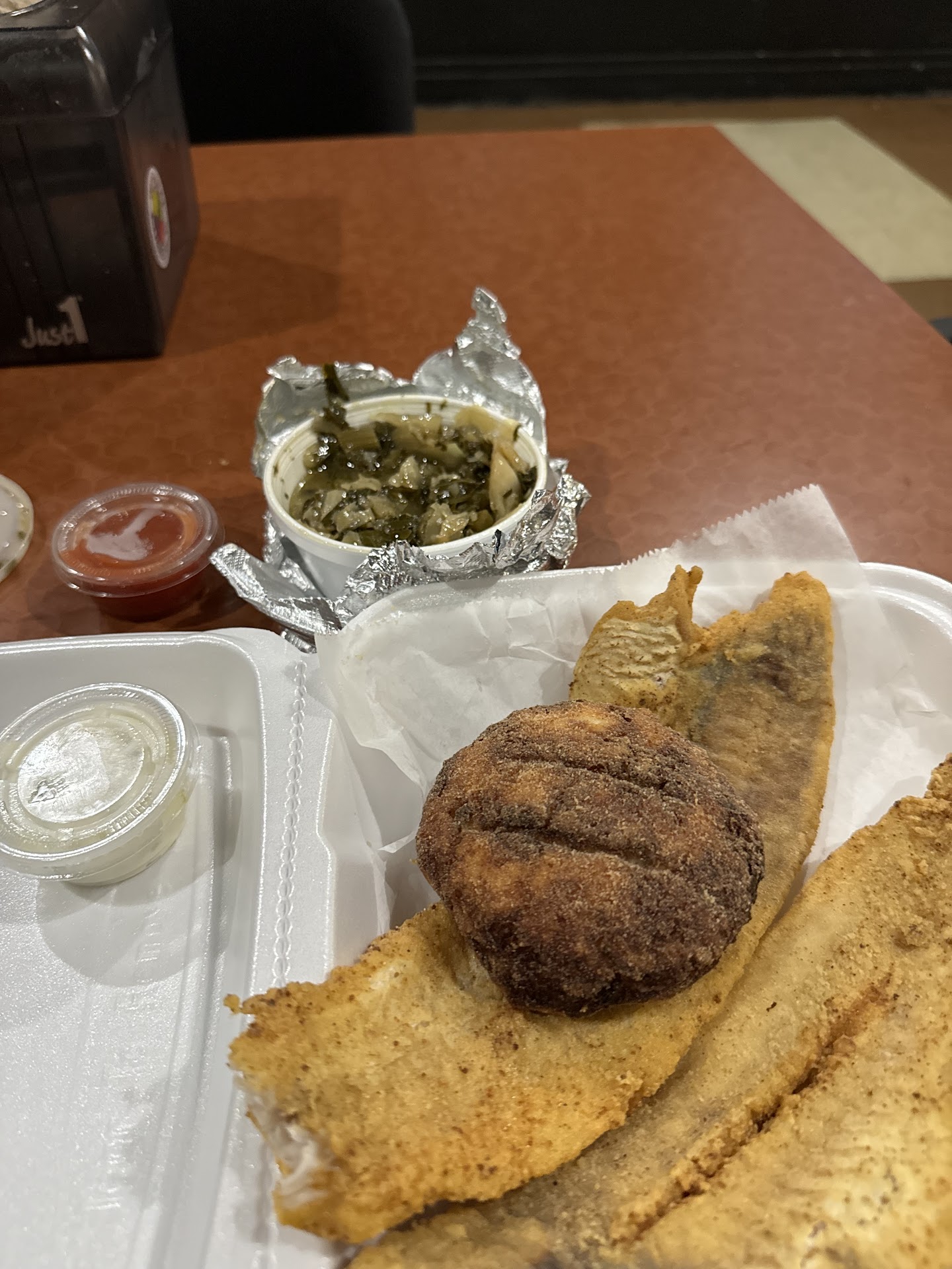 Read moreIf I could just say WOW! That would not even be close to how great this place is. From my first step in the door the owner greeted me, told him I was a first timer and he immediately offered a sample of all the sides! Greens, sweet potato, Mac and cheese, potato salad, seafood salad, green beans!! Every single side was phenomenally prepared, those Greens!! Lord have mercy!!! Then he showed me the different fish, explained they are fresh daily. I got a massive lump crab cake, I don’t think it had any filler, all crab, excellent! Two! Whiting fish fillets, they were huge, for the price I paid I would have been happy with one fillet. The desserts, all home made, so many to choose from, I was going carrot and a local told me to try another and she was spot on, don’t recall the name but it had bananas and pineapple, the frosting! So good, the slice of cake must have weighed a pound, so dense. I’ve eaten around the world and this little place is some of the best food I’ve had anywhere. The best part, the owner, he’s a great human, loves what he does, loves showing you what is what and just a genuine awesome person. We need ore places like this! I’ll probably eat here all 3 days...