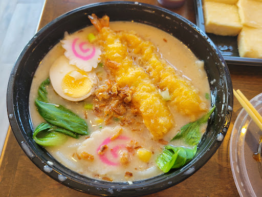Katsu Chicken Ramen was delicious. The chicken was a crispy, but a little under salted. It was early morning so may be they weren't on their A game yet. The portion was huge though. 4/5 for Katsu chicken. I also wish it was in it's own separate container to maintain the crispy, but at least the broth came on the side so I moved all the chicken into a plate. I like taking a bite of the crispy ramen and then eating taking a bite of ramen. The ramen is a tonkotsu ramen which is a pork broth. Good flavor and color and I love the fried garlic they put on top. It adds so much beautiful texture and flavor.