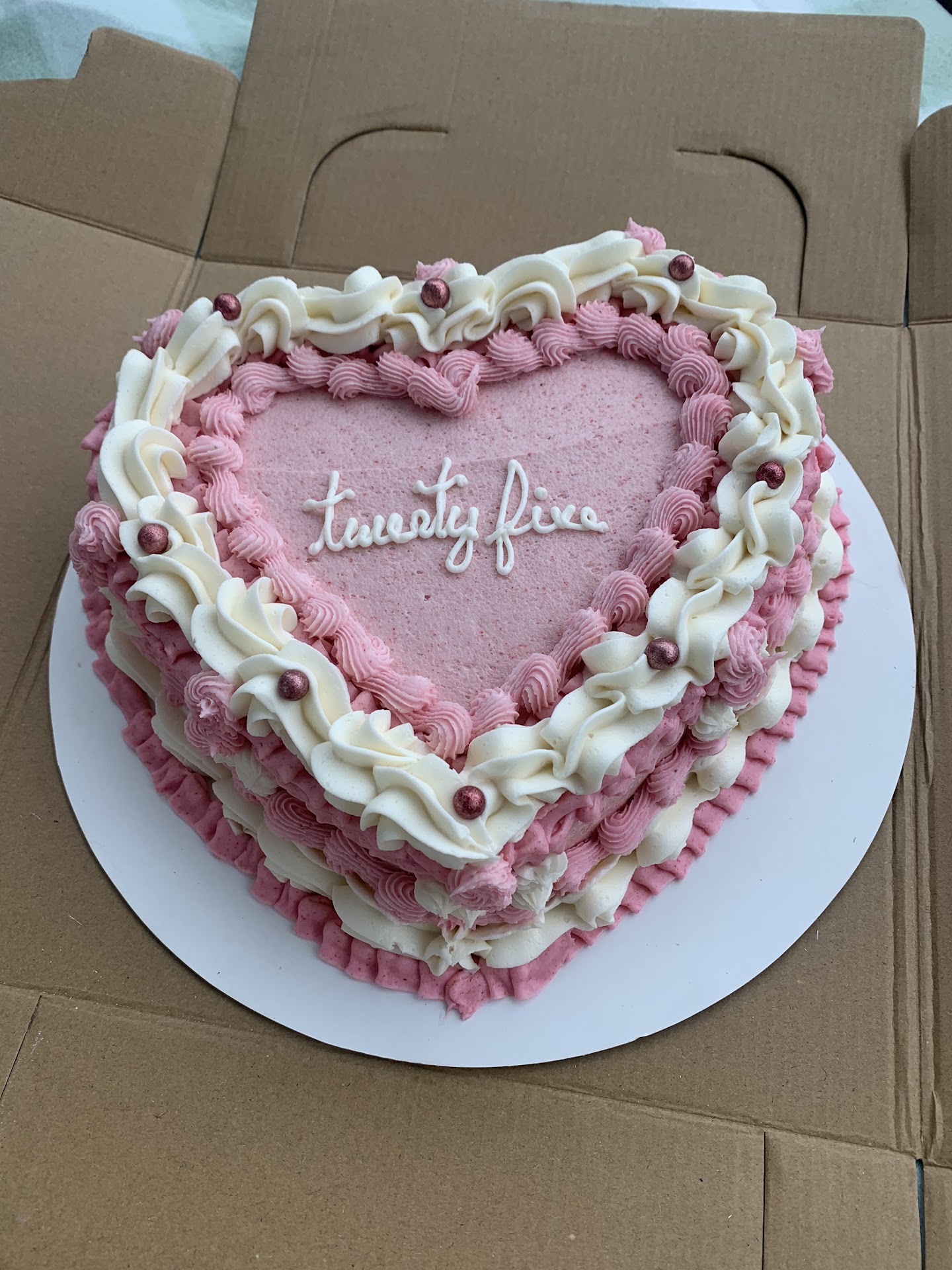 Read moreI ordered myself a heart shaped cake in light pink with white details and it was exactly what I wanted. The order was placed on a Sunday and I was able to pick up my cake the following Wednesday. Website for placing the order was very easy to use and easy to communicate with the owner. The cake looked absolutely beautiful and tasted even better. There was a good variety of cake and frosting flavors to choose from. Highly...