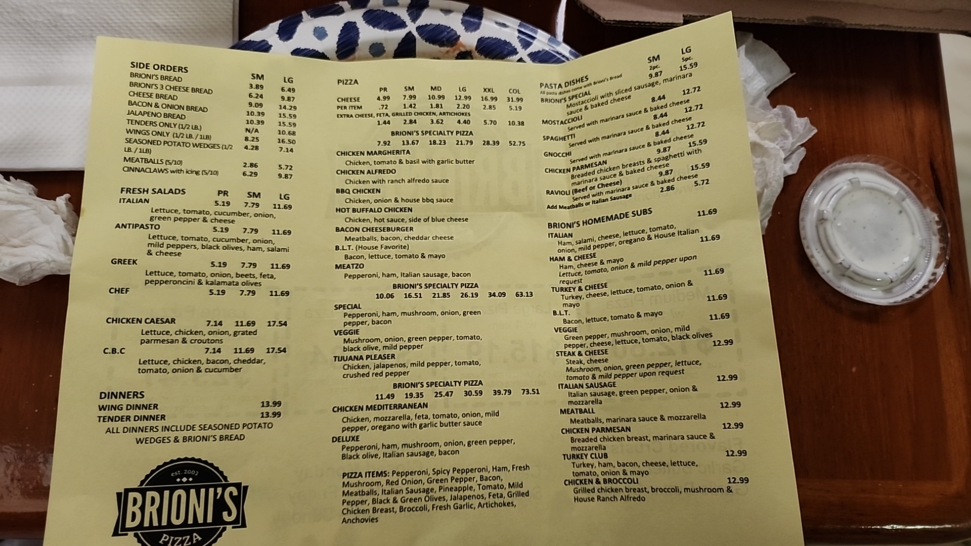 Great prices and amazing food. The chicken alfredo pizza was to die for. During Covid, the business asks you to order ahead and wait in your car to pickup which worked wonderfully. Everyone had masks and were so sweet. Definitely making this place a regular spot to eat. EDIT 1.17.2021 So I'm pretty disappointed in Brioni's handling of Covid thus far. When I first moved here back in July, they were doing great at precautions.