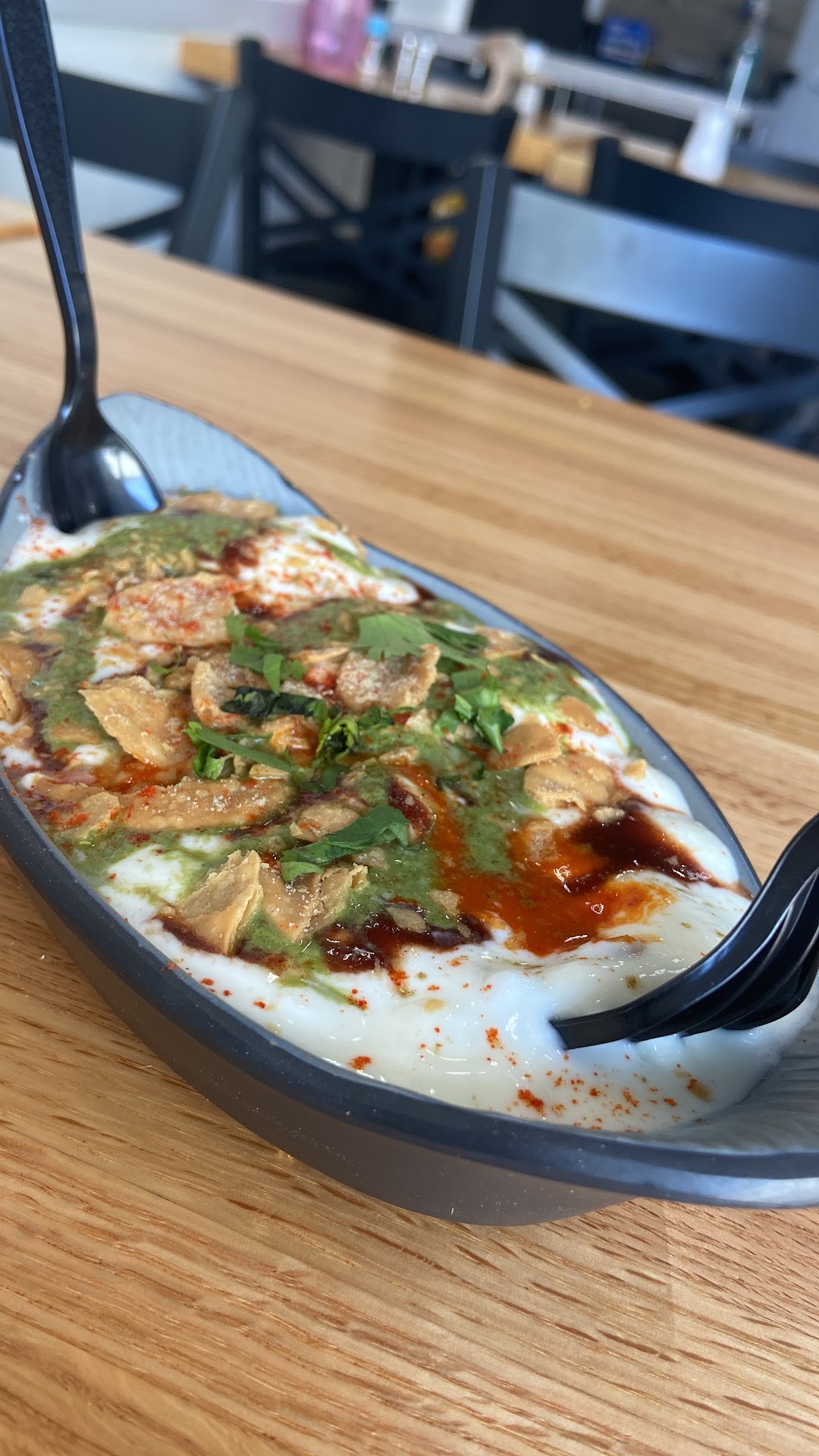 VERY LITTLE CURD ... THE SAMOSAS WERE BIG BUT TOO SPICY .. OVERLOADED WITH CHICKPEAS.. BOILED MASALA CHICKPEAS WERE SPICY TOO AS THERE WASN'T ENOUGH CURD OR SWEET CHUTNEY TO BALANCE THE TASTE...