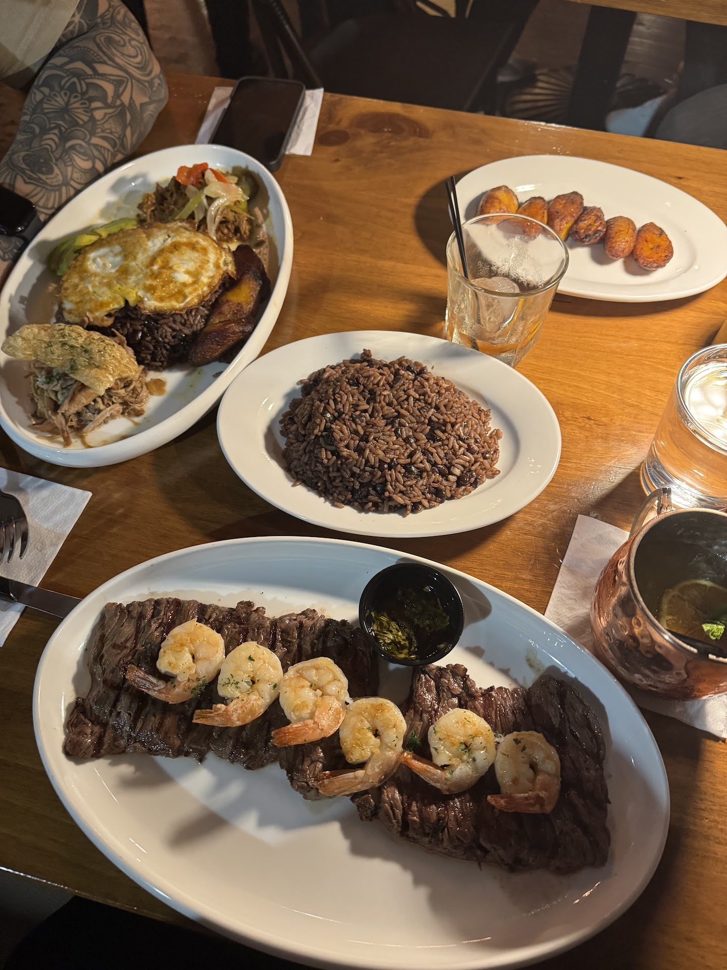 For our main courses, I had the Churrasco with chimichurri and shrimp, paired with maduros and congri — everything was delicious and cooked to perfection. My boyfriend ordered the Bandeja Cubano and loved every bite. The atmosphere of the restaurant was lively and fun — we didn’t come in to celebrate a birthday, but we witnessed one nearby and the celebration was so energetic and festive! It’s definitely something to experience.