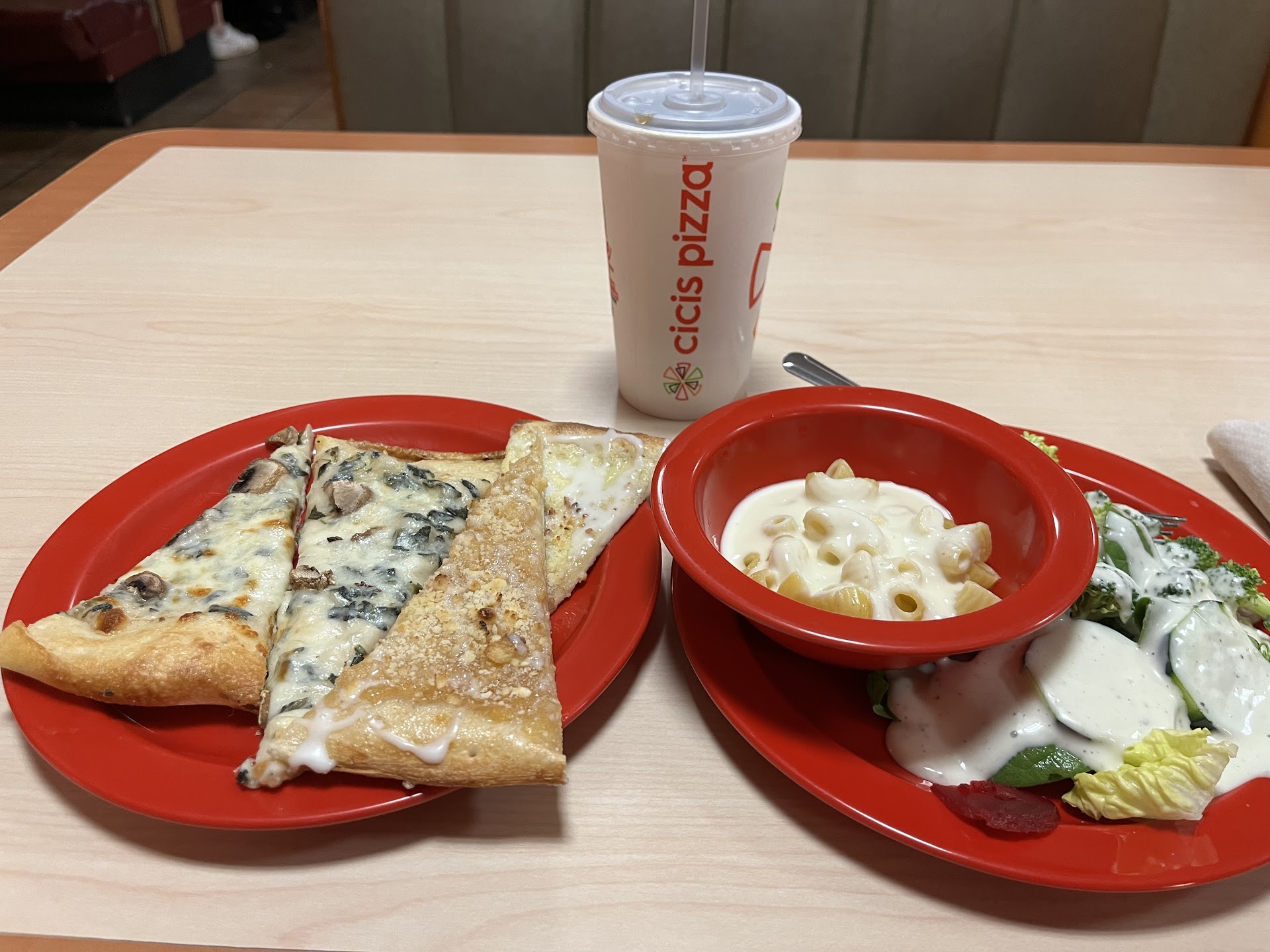 Read moreMy family of four visited CiCi's for a late lunch/early dinner on Saturday. When we arrived, there were only 2 tables clean, but many tables did not have people sitting at them. We sat at a table for 6 because the only 2 tables clean had seating for 6. Ok. We can manage that; however, the fact that all of the other tables had plates, food, silverware, etc. still there was quite gross. The cheesy breadsticks were cold, as was much of the pizza. They did make the one pizza we requested. The noodles for pasta were also cold. They no longer have parmesan cheese, salt, pepper, or dried peppers on the table. You get these in packets from the area where you get the drinks. They didn't have any lids for the kids' cups. And now for the worst part...