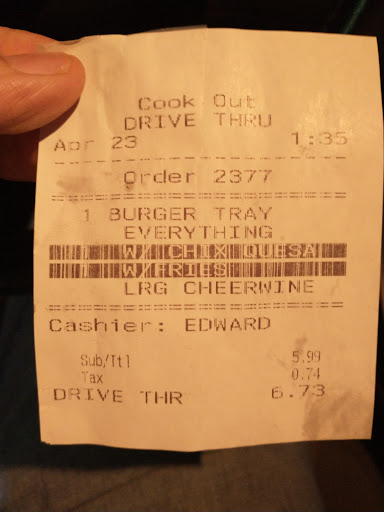 Read moreCook Out is my favorite fast-food BBQ chain. They are the only ones in the areas that I frequent which offer a true North Carolina style BBQ sandwich. Not just pulled pork with a vinegar sauce poured over it, but true chopped pork in the sauce with traditional fine-cut coleslaw and a dash of Texas Pete. The best deal here is a BBQ tray that comes with the sandwich (or your choice of other entree like a burger, etc.), two sides, and a drink for a really decent price cheaper than any other fast-food combo meal from the national chains. Food is always fresh and tasty, can't say enough good things about them.