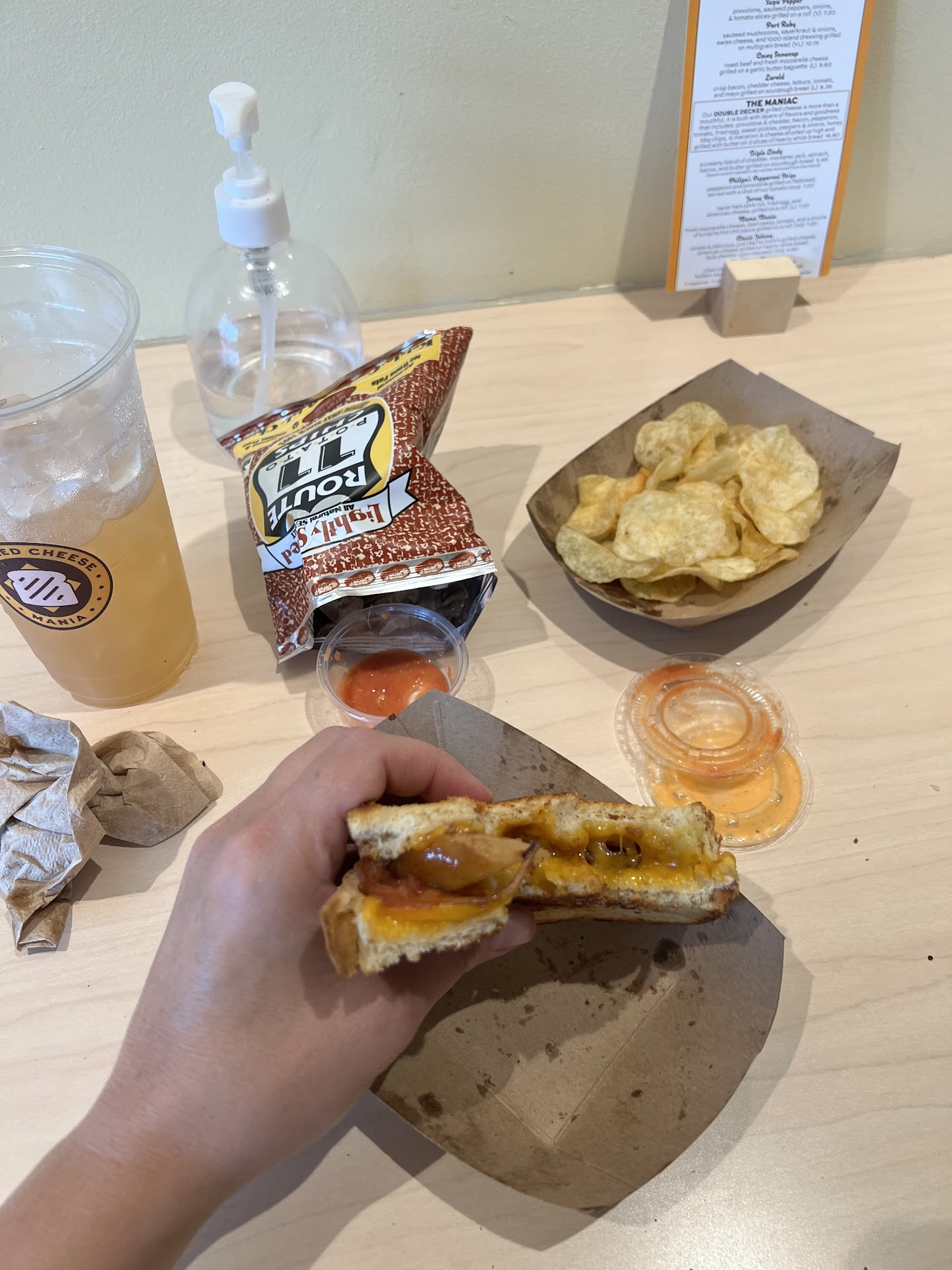 Read moreGreat find thanks to Yelp! We were headed through Harrisonburg to some hiking locations and decided to stop for lunch. We had only a short wait behind some other customers when we arrived, which was perfect because it gave us time to look at the menu and the map showing where other visitors cane from. After ordering two sandwiches and a shot of tomato soup for dipping, we selected an indoor table. There's a sign around the tables suggesting that the place can get really busy and to be mindful of spending too much time at the few tables, but thankfully for us, there was plenty of room for us and the other families and friend groups. There's plenty of outdoor seating too, but the day was too humid for us to have hot sandwiches outside. As for the food, we were so happy with our Harrisonburg just-passing-through lunch choice! The bread was perfectly toasted with a pleasant crunch and the melty cheese on both of our sandwiches was that wonderful kind of velvety consistency. I loved the soup shot too, especially since I wanted the flavor and experience without the heat of a full serving of hot soup....