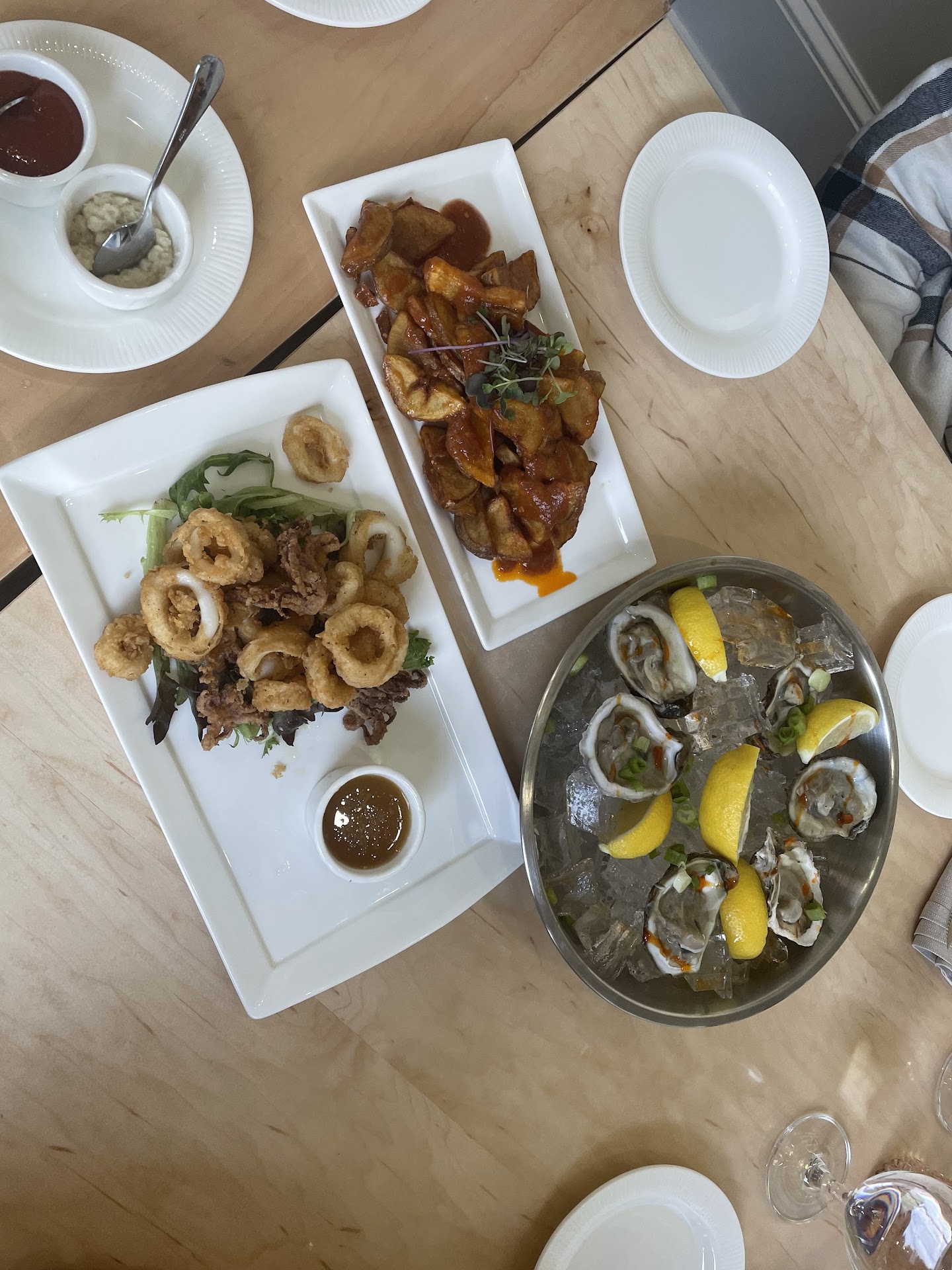 We had a reservation for 3 at 6:30, right in the middle of the short operating hours of 4:30-9:30, There were not many customers inside, the outdoor tables were slightly more populated and we were given a three top in the bar/lounge area, right next to the kitchen door. Honestly thought this area was the entire restaurant until I went to use the bathroom and saw the real dining area with one person at a table, at this point, I also saw through that side's entrance into the kitchen, the plethora of Sysco boxes and quicky realized what we were in for. As the night moved on, almost all new customers were sat in the proper dining room and not in the incredibly loud, horrific acoustics in the lounge. Cool.