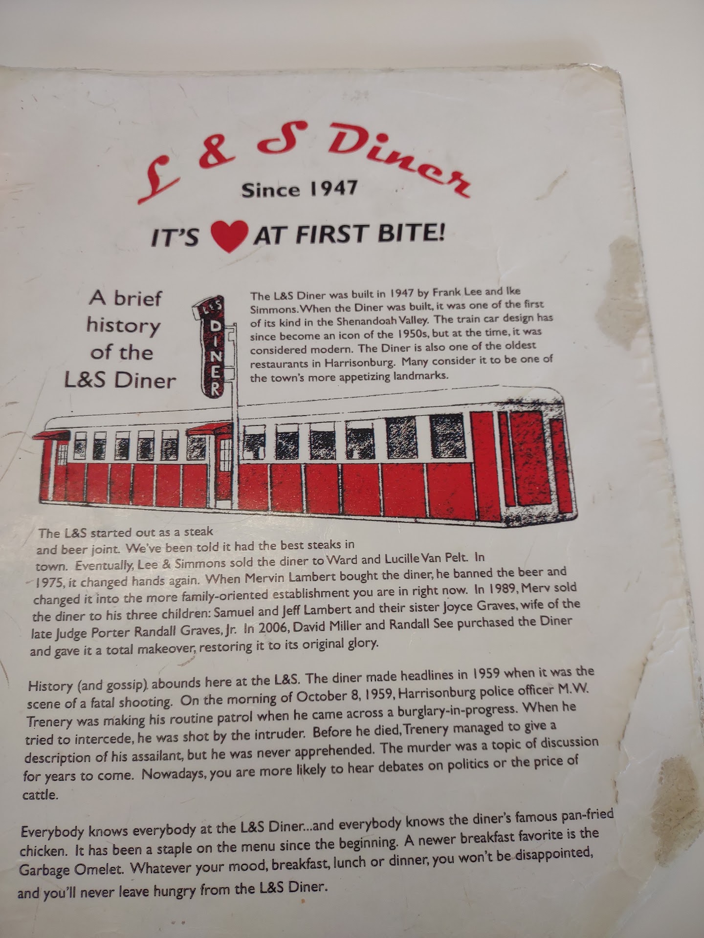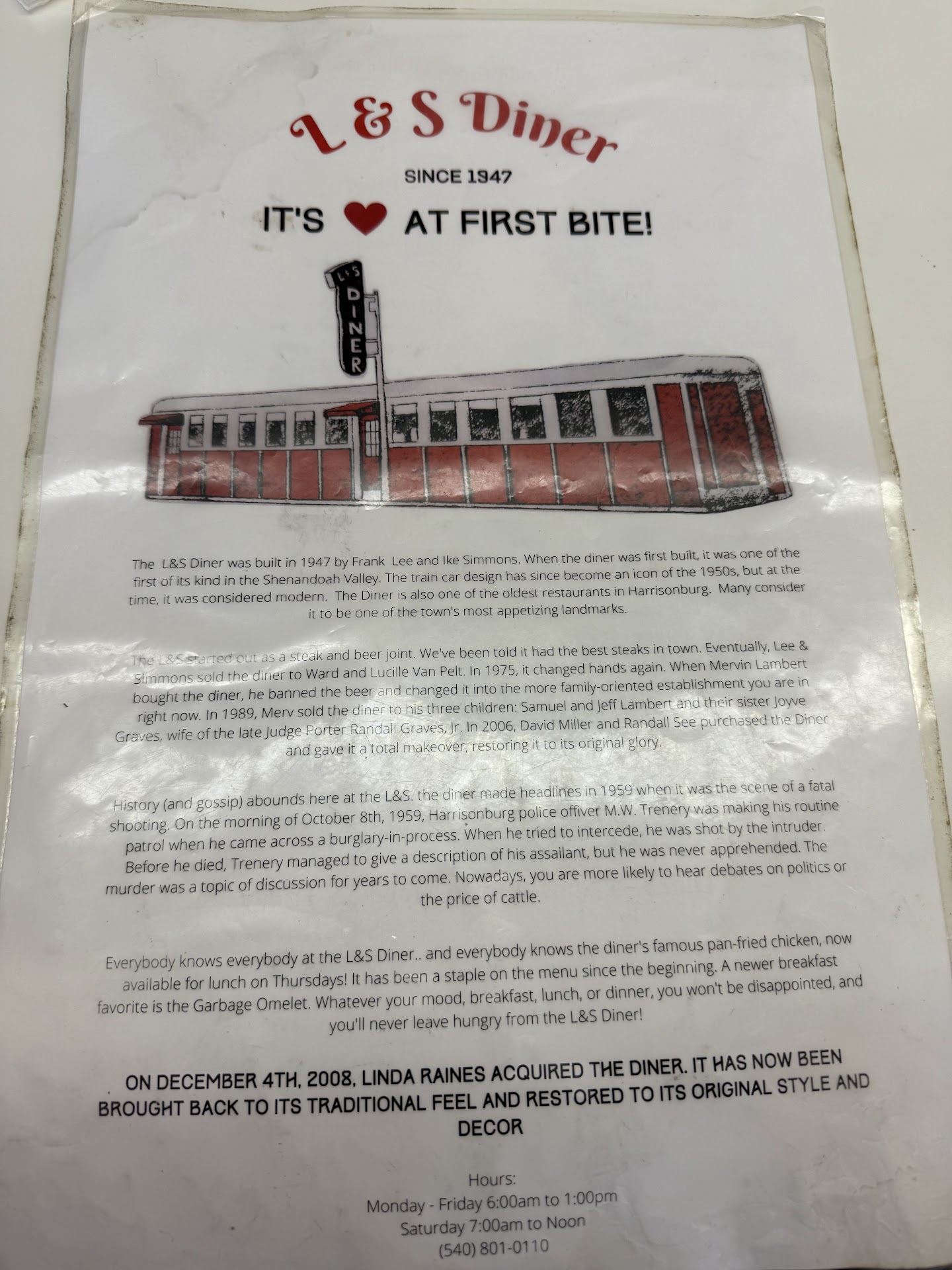 Read moreMy sister-in-law and I tried this diner out yesterday. She had the garbage omelet and I had the biscuits and gravy with home fries. I cannot comment on her food except to say she said it was delicious and she wanted to come back again next week. My food was really good, and it was ready quickly. While the home fries could've stood to be grilled a little longer, they were still pretty good. The biscuits and gravy was amazing though! Biscuits were crumbly on the bottom and soft in the middle, the gravy was seasoned just right. Just like my grandaddy used to make! Please be aware they only take cash and check. This is the only problem we ran into because we didn't have cash on hand. Another customer kindly offered to loan us the money to pay for our meals which 💓💓💓 (thank you so much to that lady and her husband. Faith in humanity for Harrisonburg is restored.) My SIL luckily had some checks in her car. We will be coming back, possibly this weekend, and bringing...
