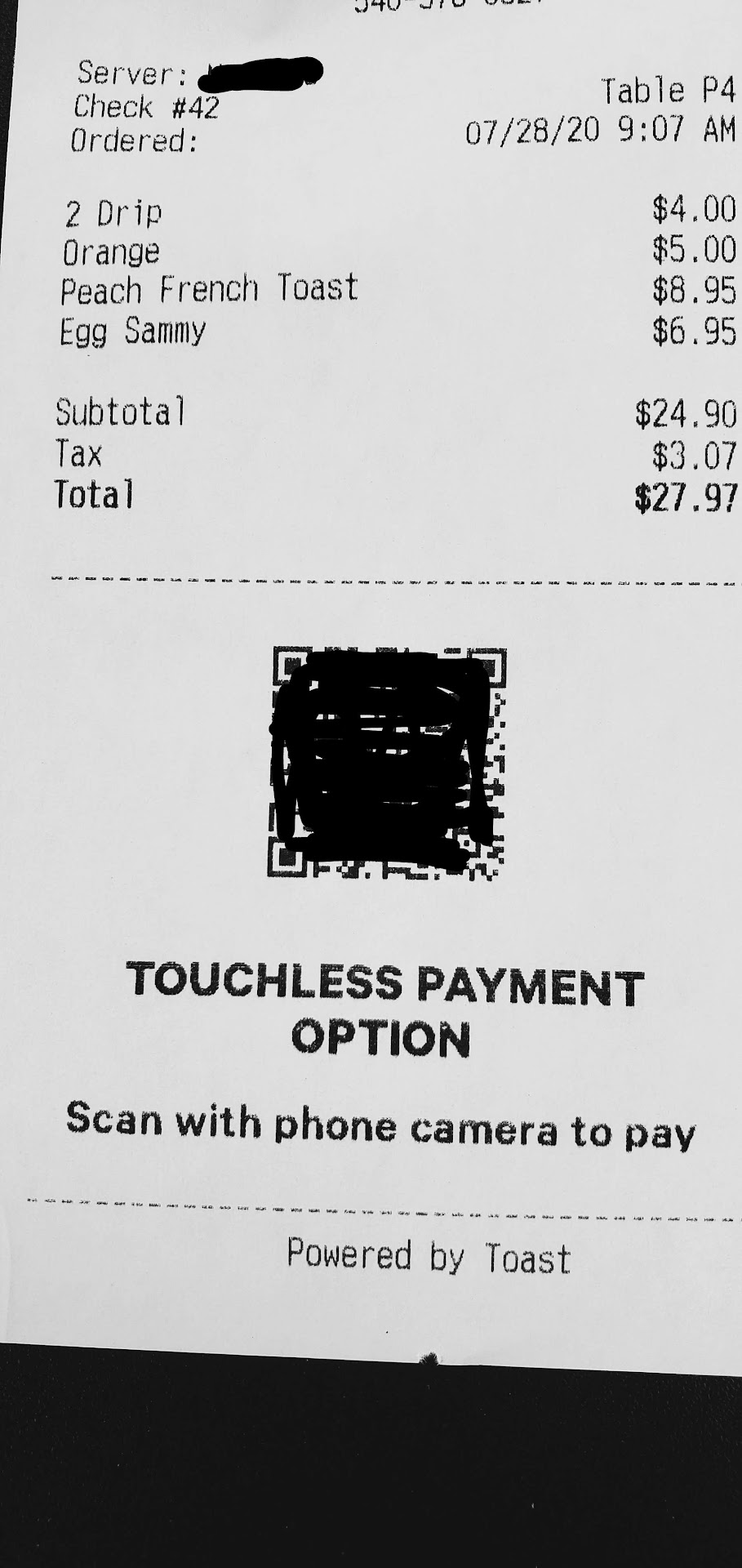 We ordered drinks and 10 minutes later our waiter came to apologize for a "mix up inside" and took our drinks order a second time since he hadn't written anything down the first time. We got our drinks in another 5 minutes. A few minutes after giving our drinks order (the first time) a server tried to give us food we had not ordered. We still had menus at our table. He seemed really lost on where to take the food, which says something about the organization inside. We didn't have our food order taken until after our drinks arrived (see #1)! While time does move differently when you're hungry, I'm pretty sure it took more than 15 minutes to get our food. This would've been acceptable if we had ordered food at the same time as drinks or when they should've arrived but due to the "mix up" we didn't have food until 30+ minutes after being seated. Our waiter stopped by to make sure everything was good with our food 15 minutes after serving us. I was 75% finished. Usually that check-in should happen a few minutes after serving. This made me wonder if he had any prior restaurant experience. After we were finished eating, a different server walked up to us with 2 drinks, set down one of them on the corner of our table, and walked away quickly to give the other drink to a different table without saying anything. We called to get her attention and eventually she returned for the drink and gave it to a different table. I'm not sure why she didn't take 2 seconds to say, "Hi. Iced coffee?" and make eye contact with one of us. We were very quick to say it wasn't ours but she was gone in a second! Our server never refilled our water cups. Normally not a big deal but the cups are small! Glad I didn't order something I expect refills on. Our server never asked if we wanted another drink (mimosa) or anything! He didn't try to sell us on dessert either. Not that I wanted another drink but it would've been a great segue to "no, but can I have some more water please?"