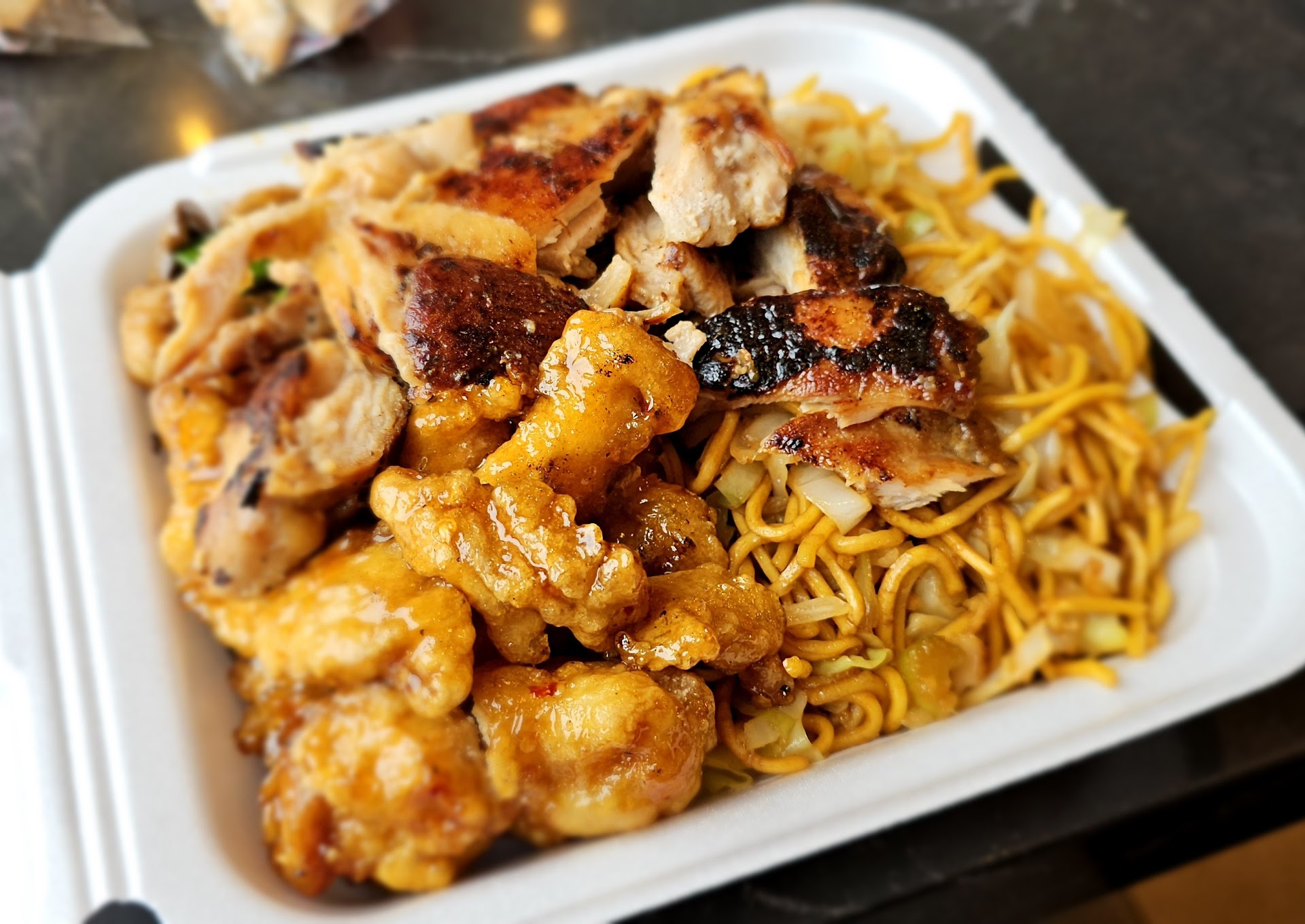 The food is weird. I got Orange Chicken, Black pepper Chicken, and Grilled Teriyaki. The Orange Chicken was the best, but still had a synthetic orange flavor. Both the Black pepper Chicken and Grilled Teriaki have this " Formed and Extruded " taste, I couldn't finish eating those. I wasn't sure that they got my order correct at first. The cheese wantons weren't too bad, but I was surprised that they didn't come...