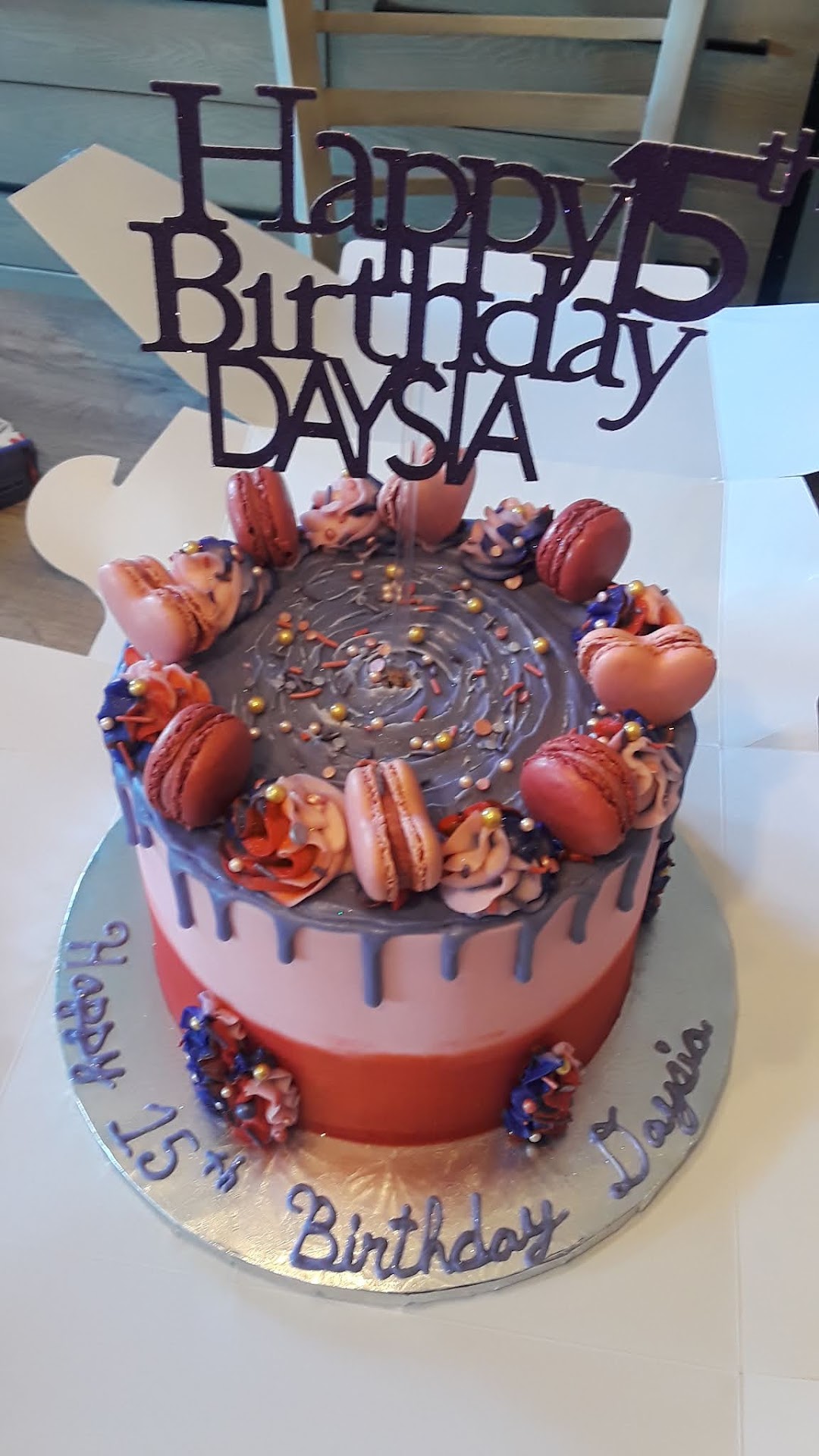 At 2pm, we had to drive to the party venue and I checked on the cake and found that the frosting was bleeding, the sides of the frosting were cracking and the cake was slumping. I chose to keep the cake hidden away instead of displaying it like I had intended. I was very disappointed and embarrassed when I then had to parade it through everyone the way it looked.